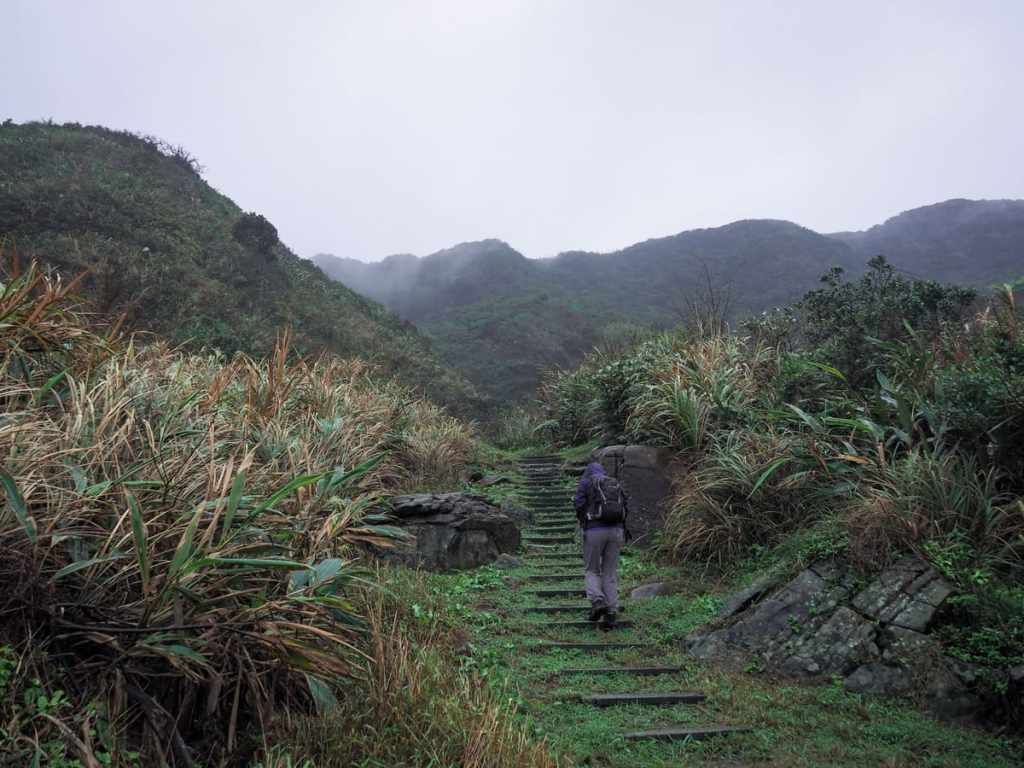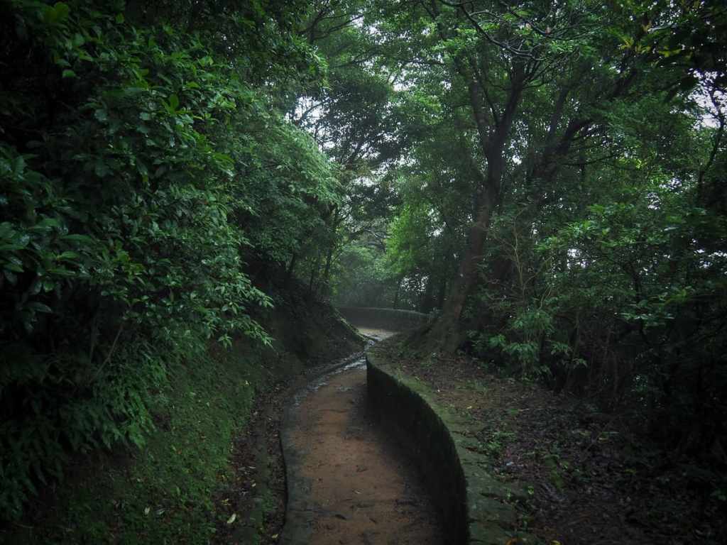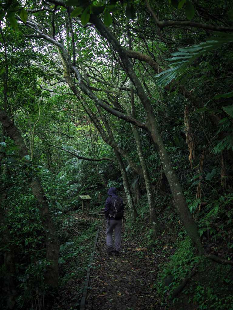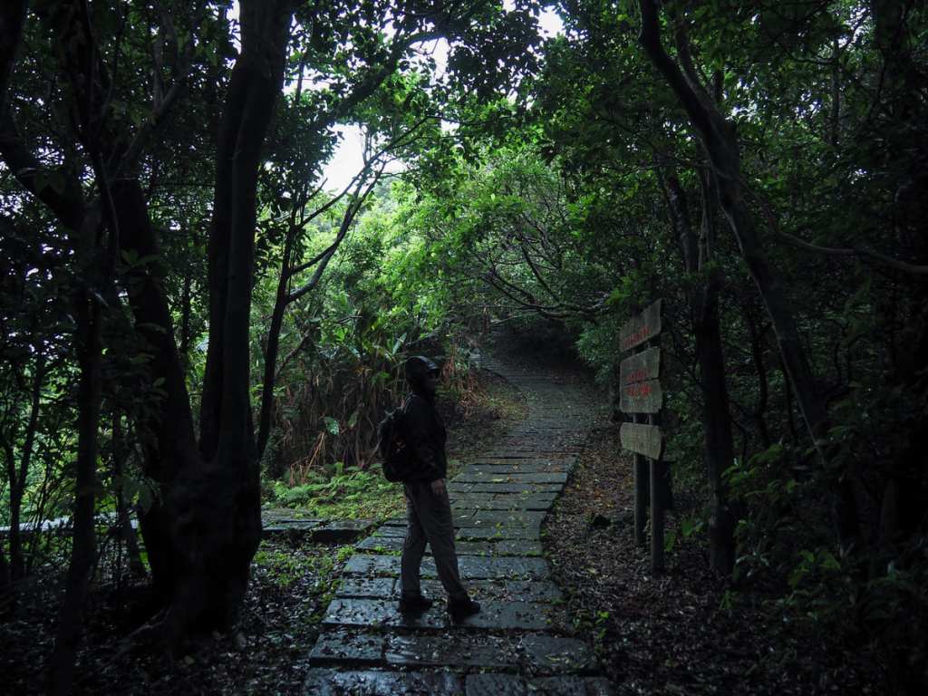 When we’d set off from Taipei, the weather had been dry, if a little grey, but the further east we went, the lower down the clouds were sitting, and by the time we arrived at the trailhead, a light drizzle had started to fall. However, that’s pretty much par for the course in Keelung, so we decided to stick to our plans. The walk leaves the coast by cutting behind a temple, coffee shop and rechao restaurant, then starts off by climbing Haixing Trail. Once a branch of the “Fish Road Historical Trail” (魚路古道), the route was originally used by fishermen transporting their wares from the coast to the city.