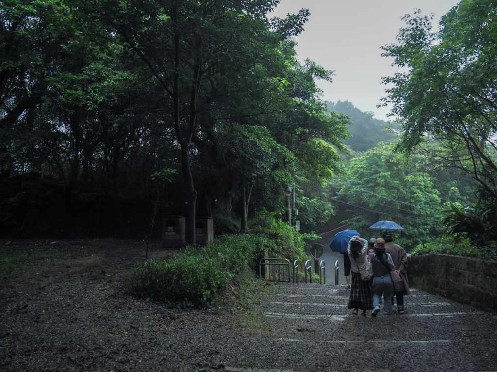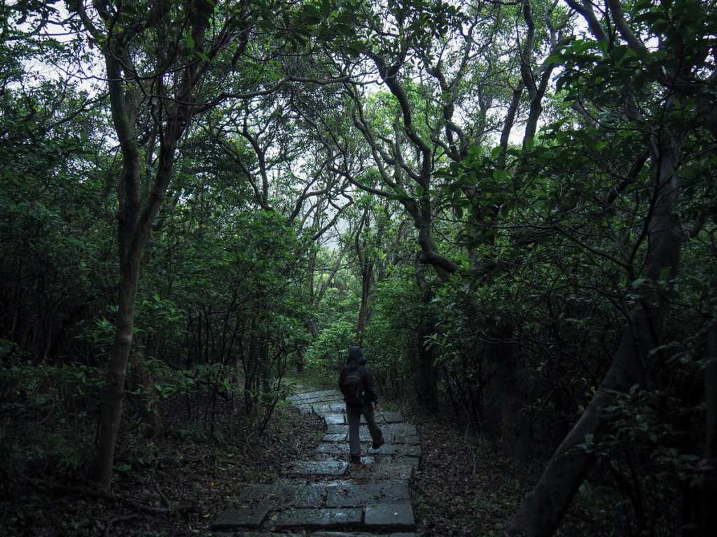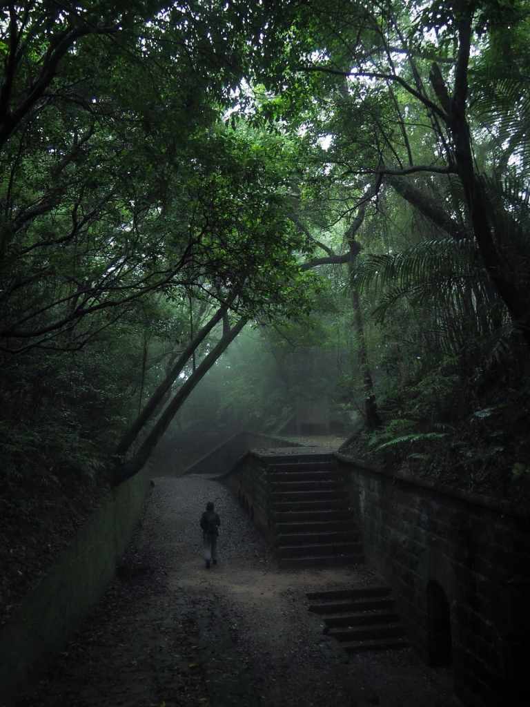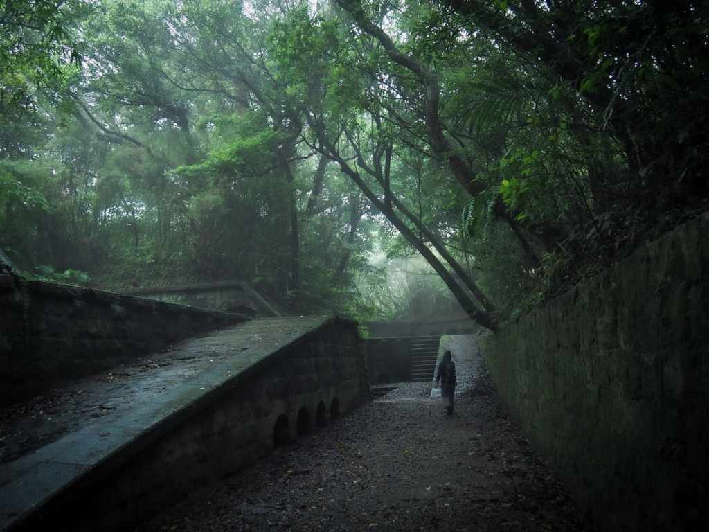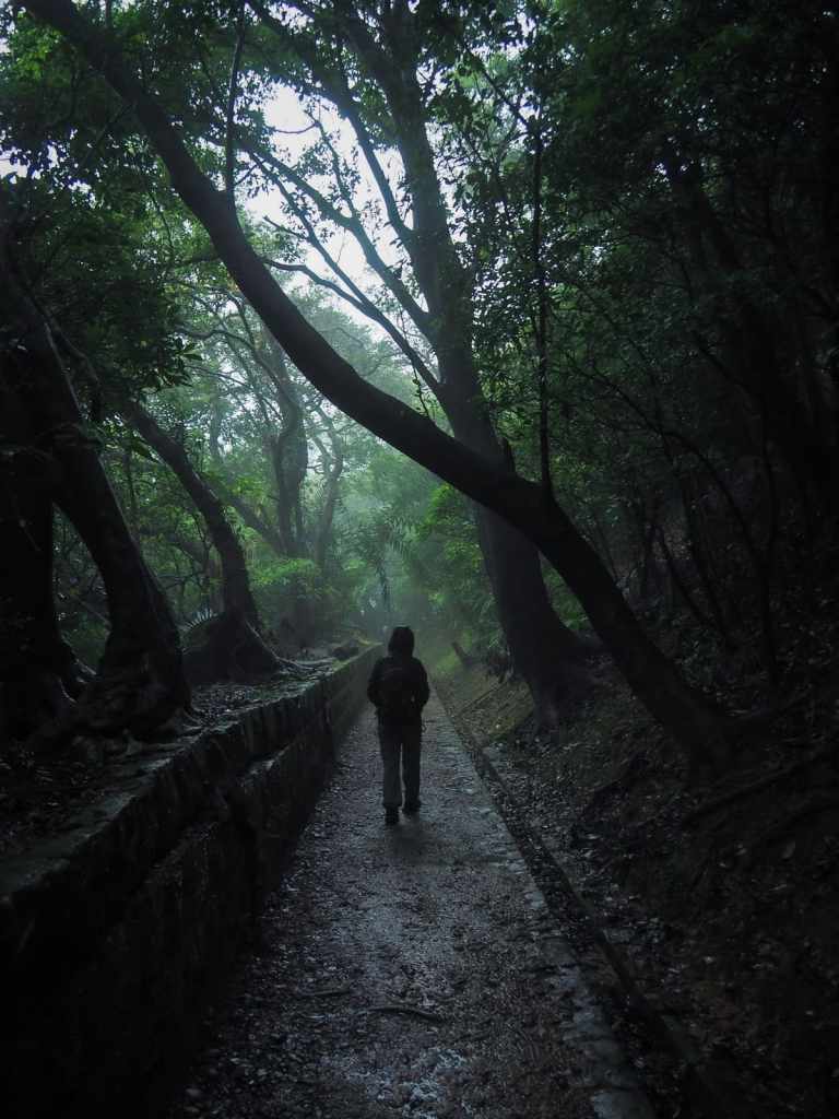 When we’d set off from Taipei, the weather had been dry, if a little grey, but the further east we went, the lower down the clouds were sitting, and by the time we arrived at the trailhead, a light drizzle had started to fall. However, that’s pretty much par for the course in Keelung, so we decided to stick to our plans. The walk leaves the coast by cutting behind a temple, coffee shop and rechao restaurant, then starts off by climbing Haixing Trail. Once a branch of the “Fish Road Historical Trail” (魚路古道), the route was originally used by fishermen transporting their wares from the coast to the city.