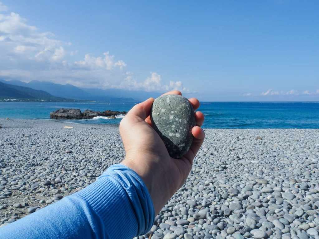 There is a mini maze of paths, but they all head towards the bridge, so I opted for the one that would take me down to the rocky beach. Most of the beach was covered in sea-smoothed volcanic pebbles like this one, light grey, speckled with white, and hot to the hand after an afternoon in the sun.