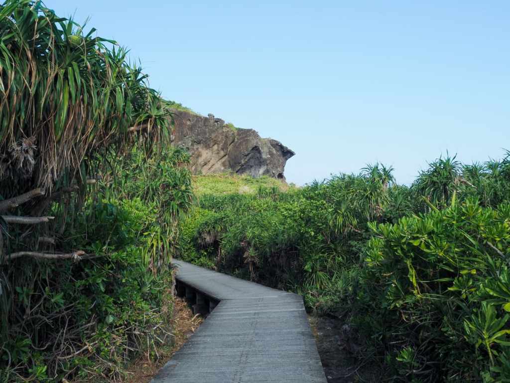 At the far side of the bridge, a raised boardwalk cuts through the foliage. The spiky, point ones are screw pine, and the trees with more rounded leaves are beach cabbage.