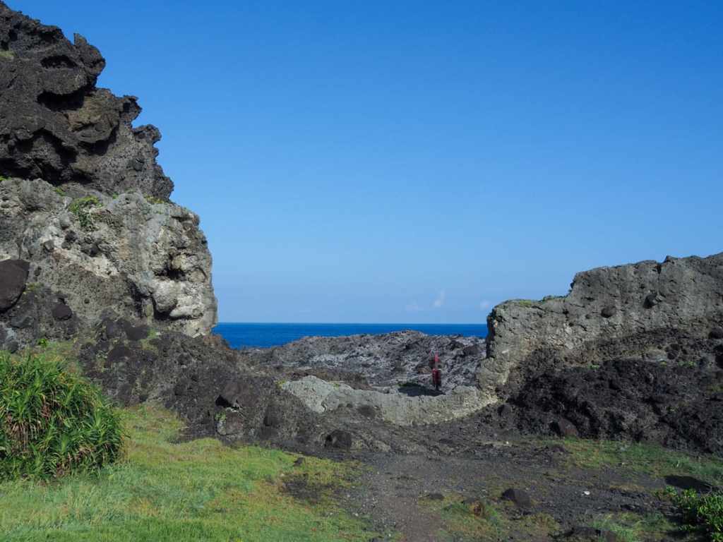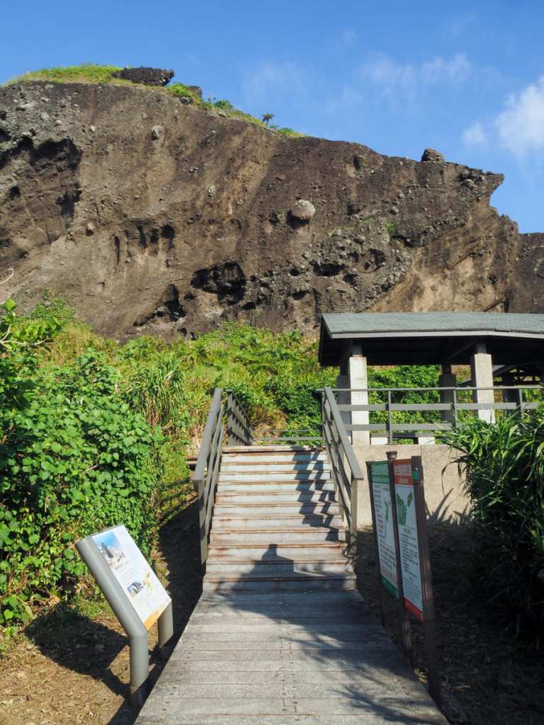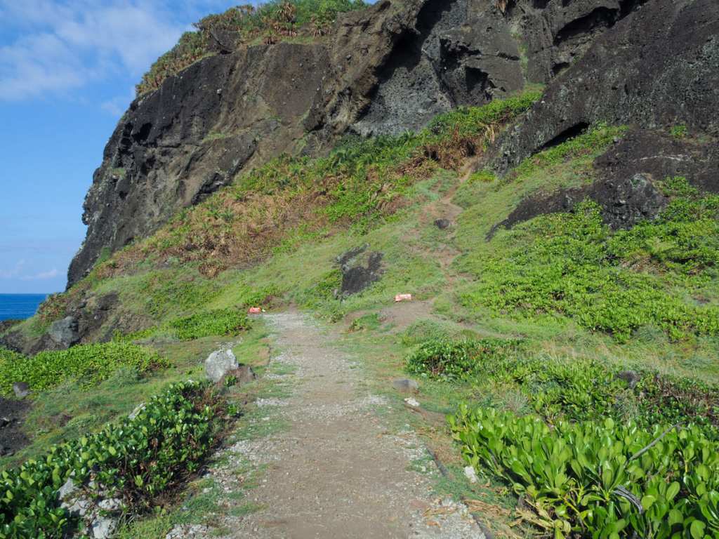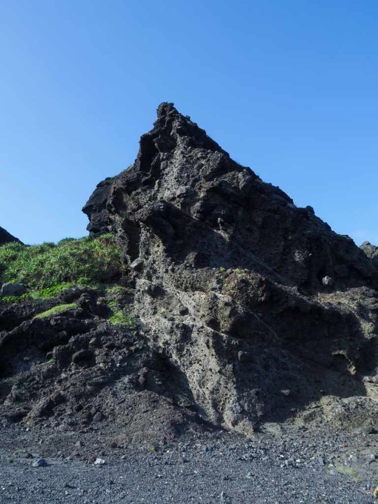 A craggy spire of volcanic agglomerate rising from the rocky beach. The trail heads around the southern edge of the islet’s small peaks, just far enough away from the rock face to keep the risk of being hit by loose rocks to a minimum.