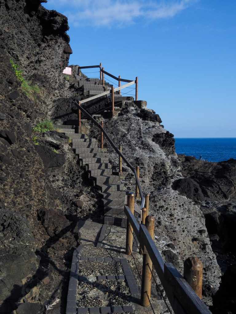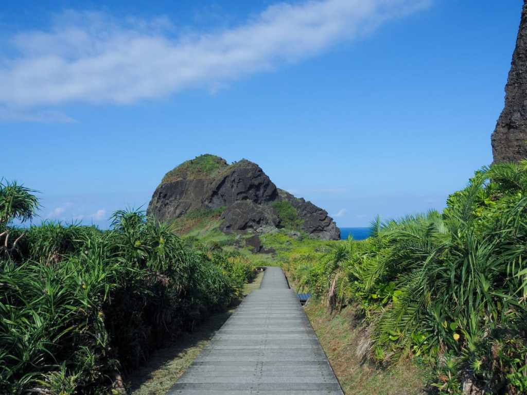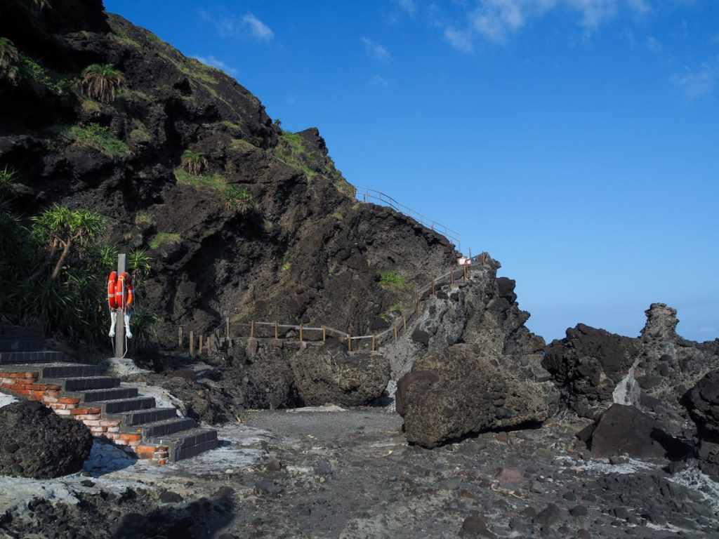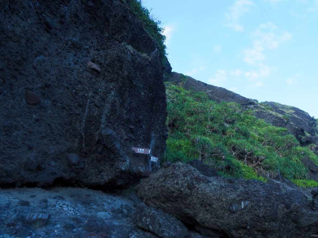 A craggy spire of volcanic agglomerate rising from the rocky beach. The trail heads around the southern edge of the islet’s small peaks, just far enough away from the rock face to keep the risk of being hit by loose rocks to a minimum.