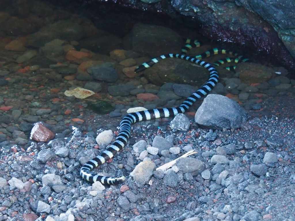 The first sea cave you come to is little more than a narrow passageway between two rocks. I passed it by because there was a couple taking photos in it, but my hiking mate for the day called me back because he’d spotted a snake. As it turned out, there were actually three snakes in the pool, all sea kraits, marked with bands of black and a pale, iridescent blue. These aquatic snakes are highly venomous but generally quite docile, and according to a guy who turned up while we were looking at them, they can often be found in this exact spot.