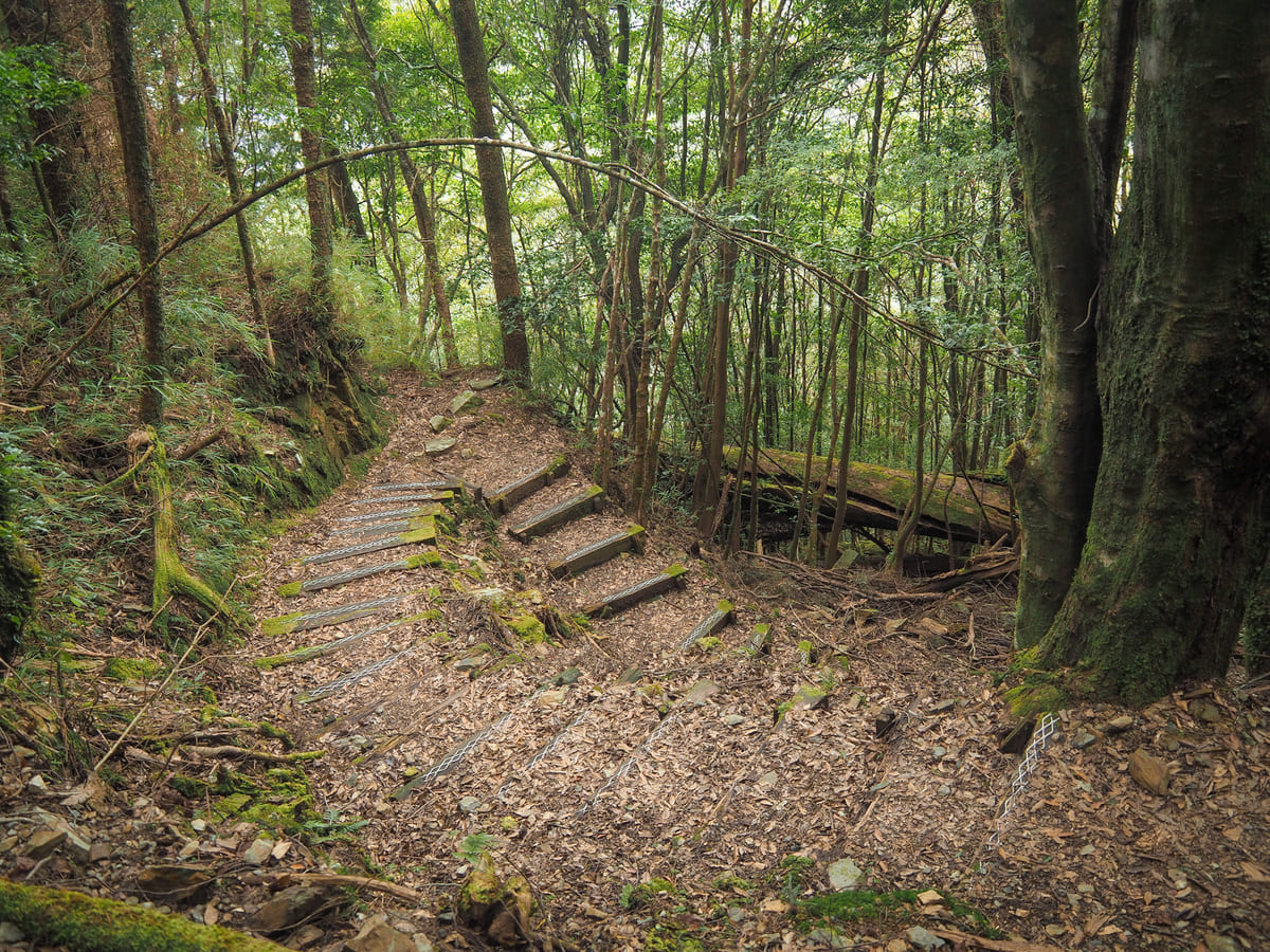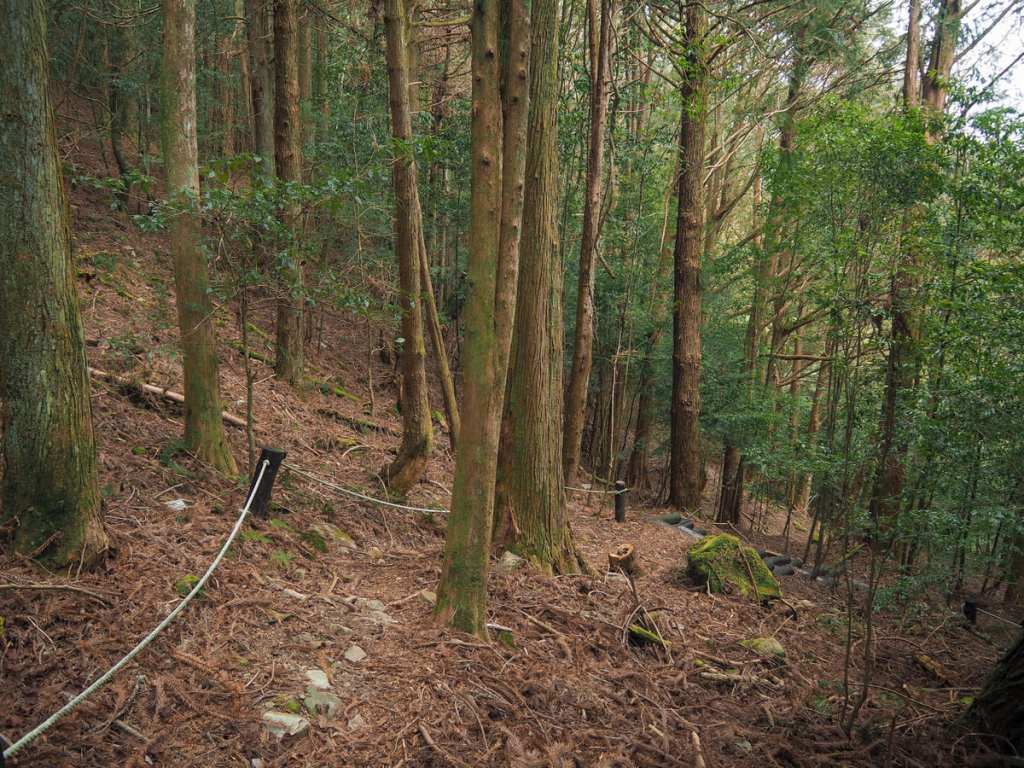 Beyond the junction, the trail begins a steep, zigzagging descent. There’s a rope beside the path, but according to the signage, it’s intended purely as a visual guide and not a walking aid.