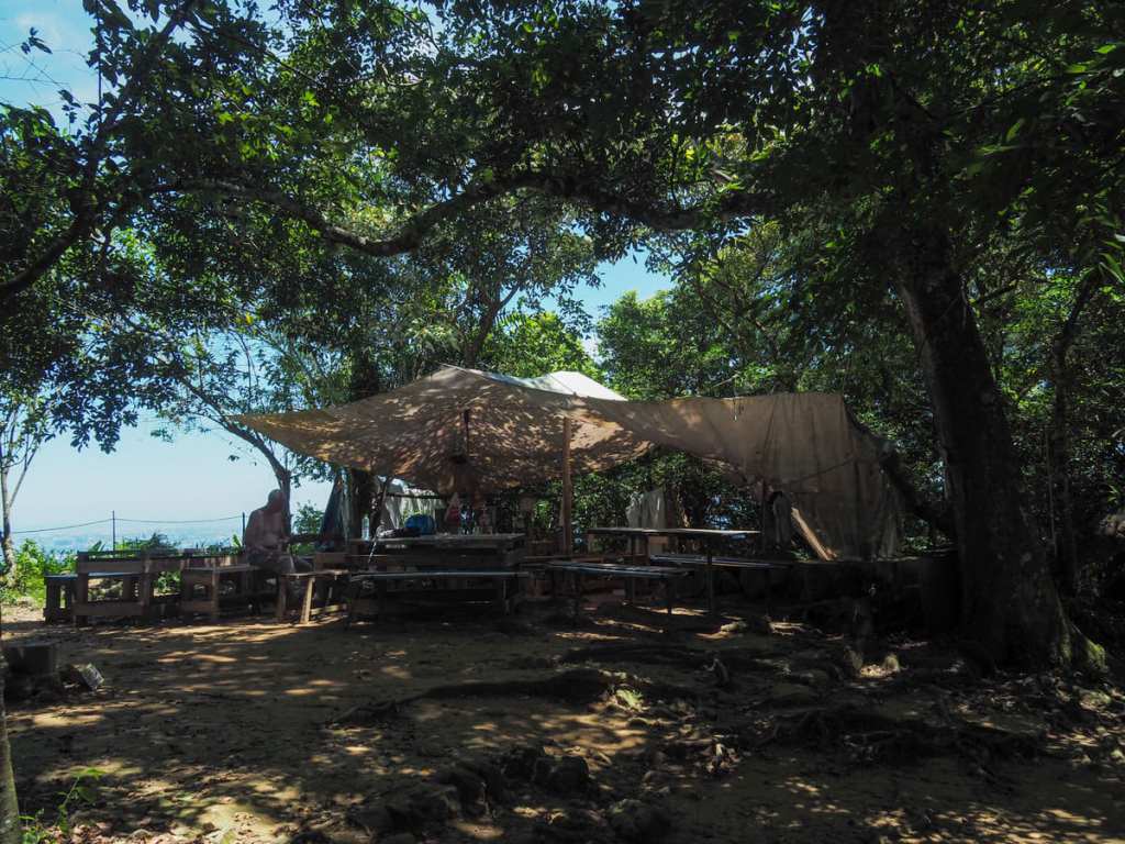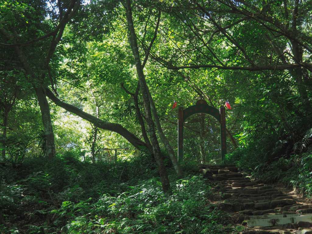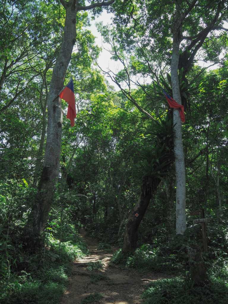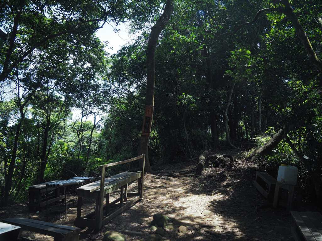 The side trail heads around the back of the first large rest area is come across before reaching this spot. There’s a shelter here and a couple of picnic tables, and the whole area is decked out with ROC flags. Like many mountaintop shelters in Taiwan, it also seems to have its own troupe of noisy retirees who know each other and camp out there all morning.