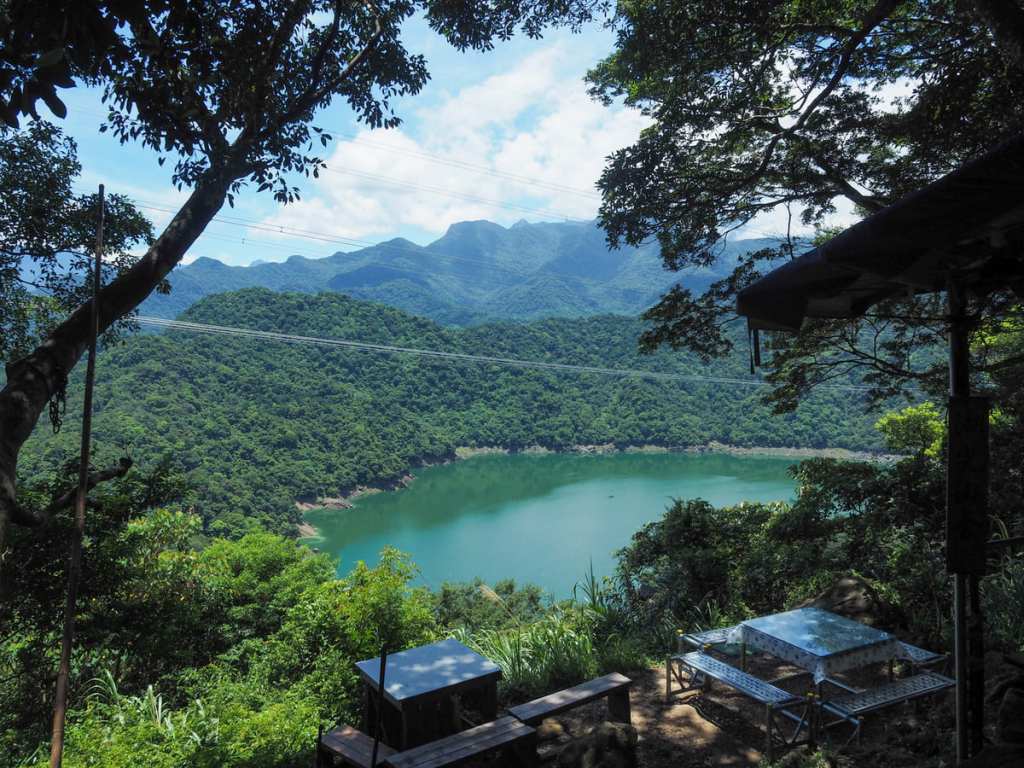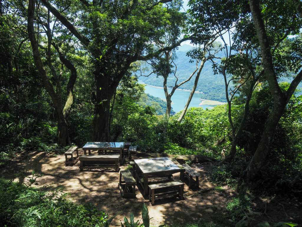 Meanwhile, picnic tables on the far side of the clearing offer a partially obscured glimpse of Shimen Reservoir.