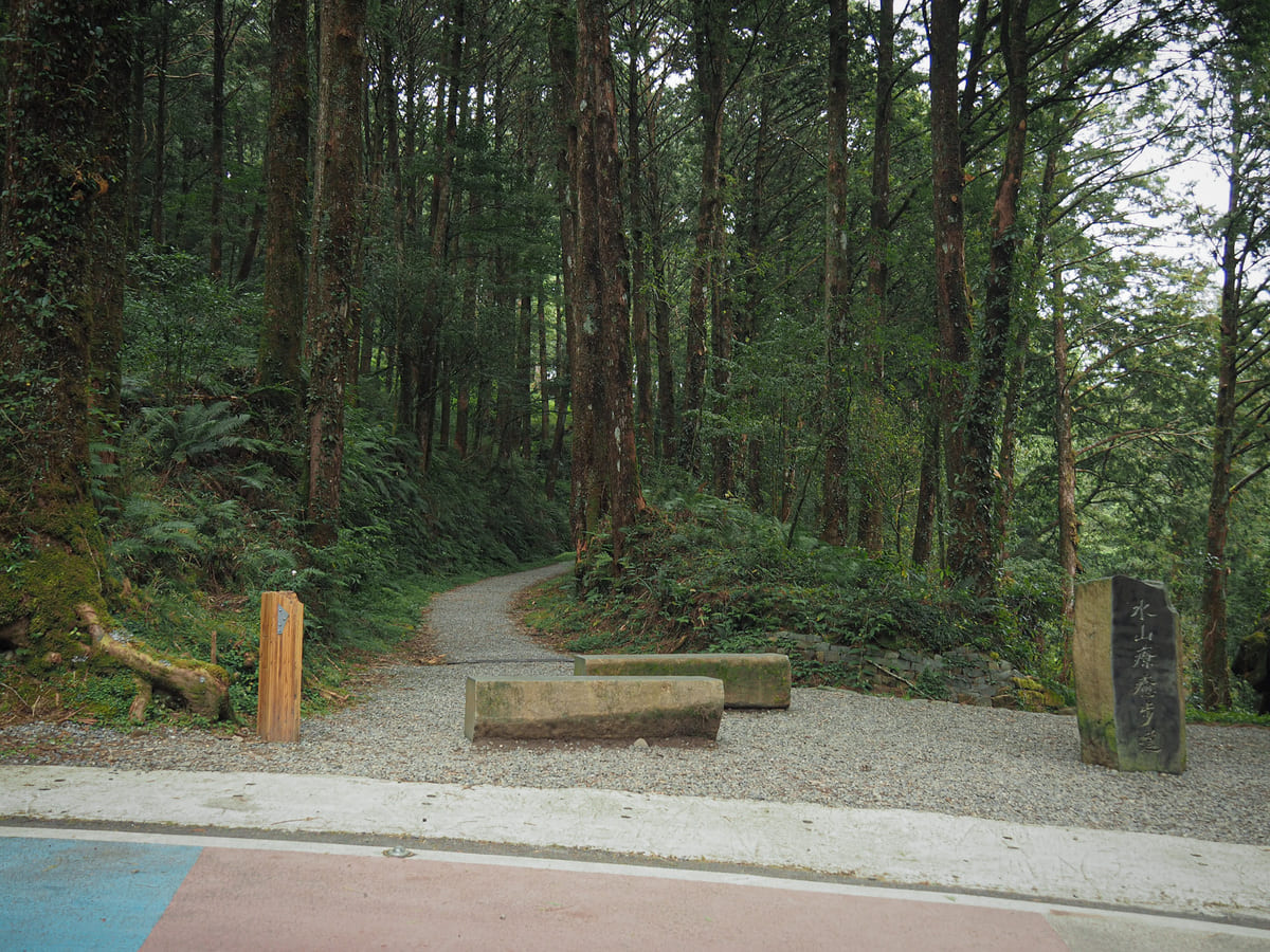 I took my time walking along the road because this section seemed to be an especially fruitful bird-watching location. The entrance of the Shuishan Giant Tree Trail is marked by a stretch of red and blue road and a couple of benches.