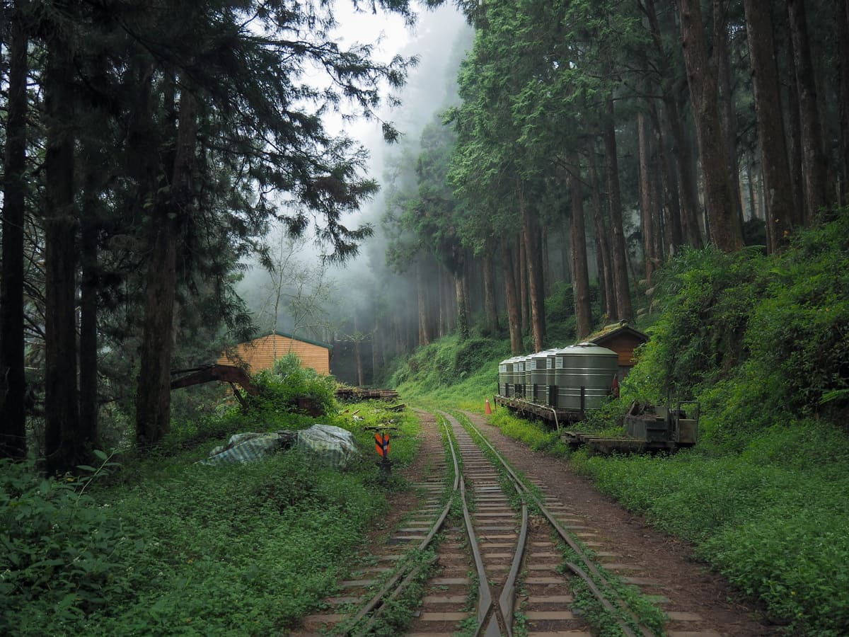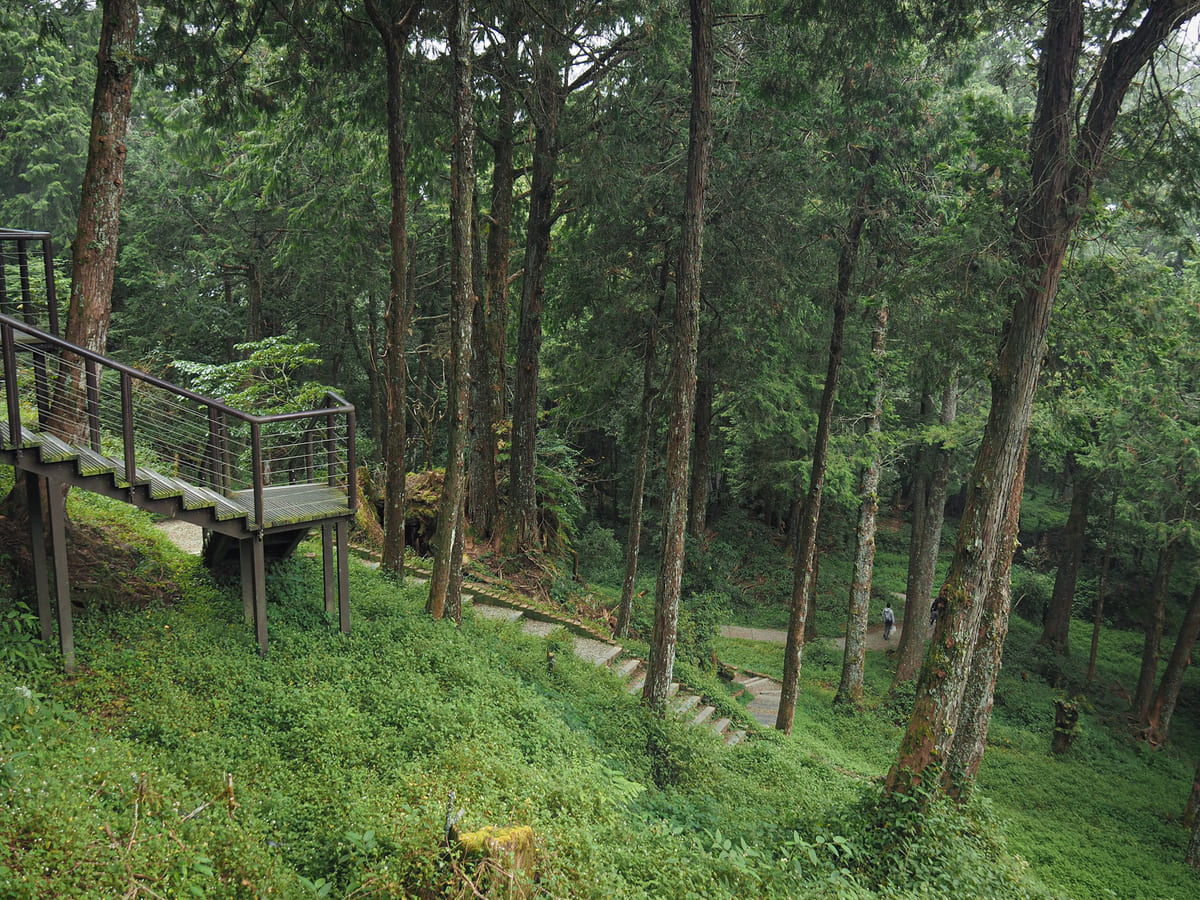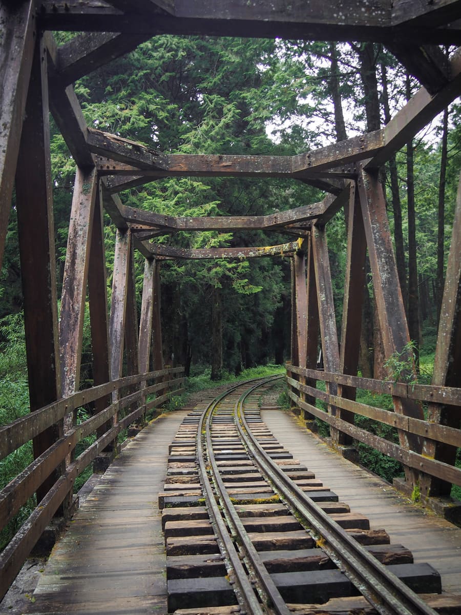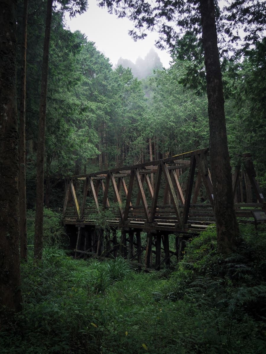After walking down from the tree’s platform, the trail joins the old Shuishan Branch Line of the Alishan Railway. n wooden trestle bridge marks the furthermost point of the line still in existence.