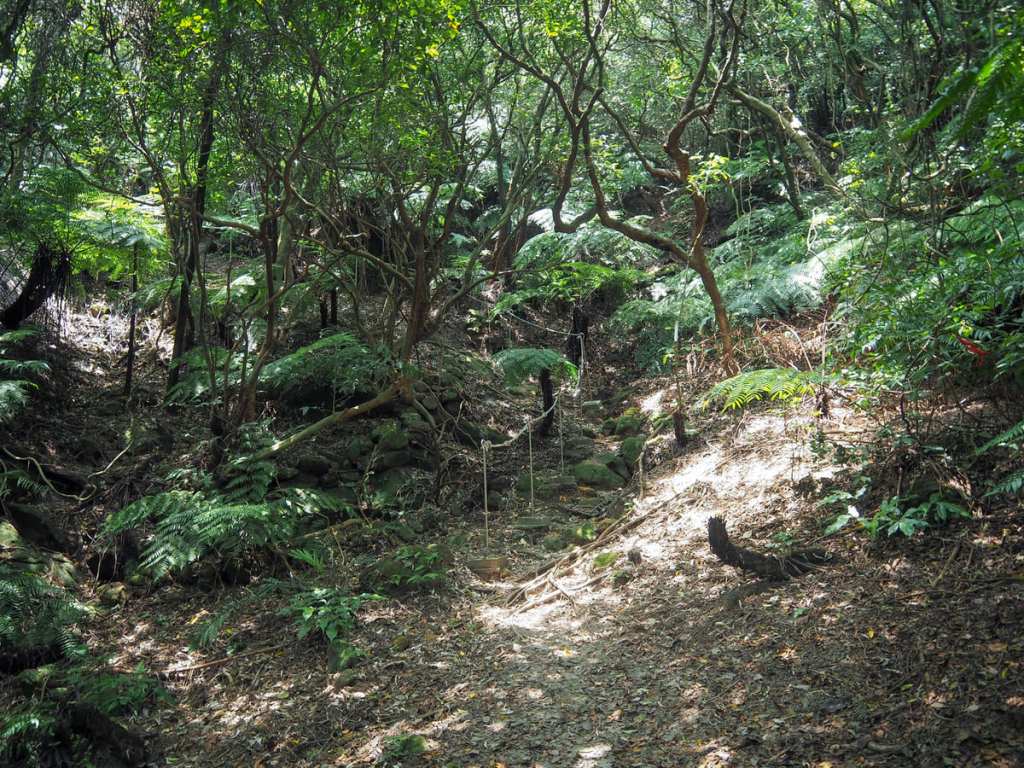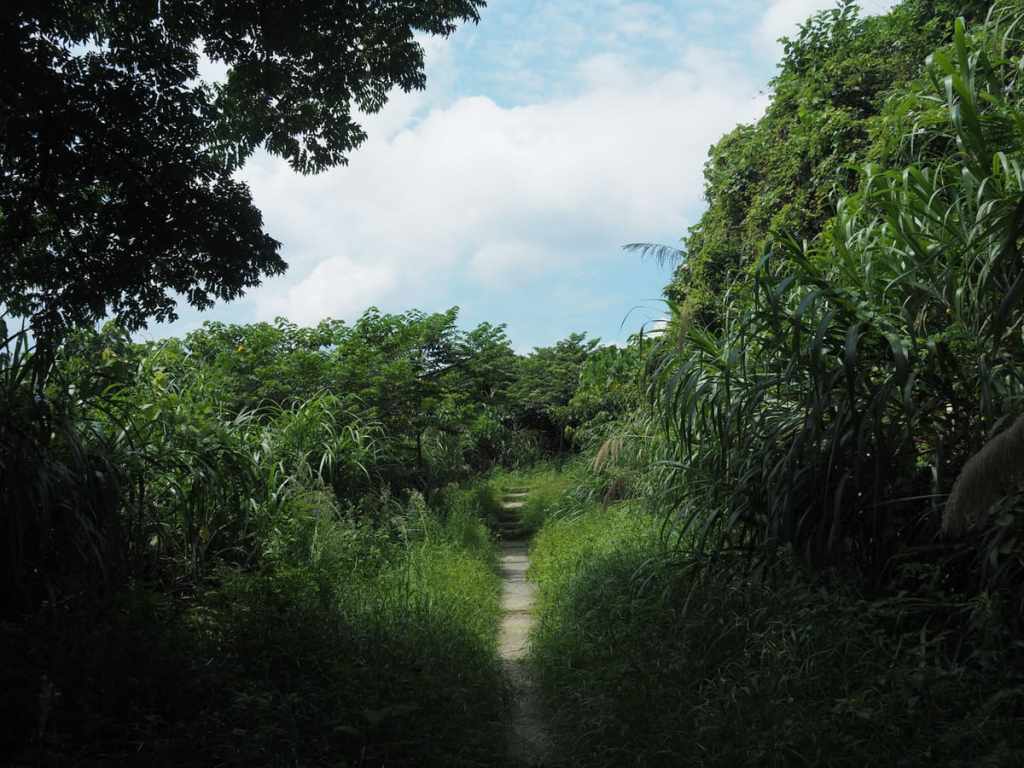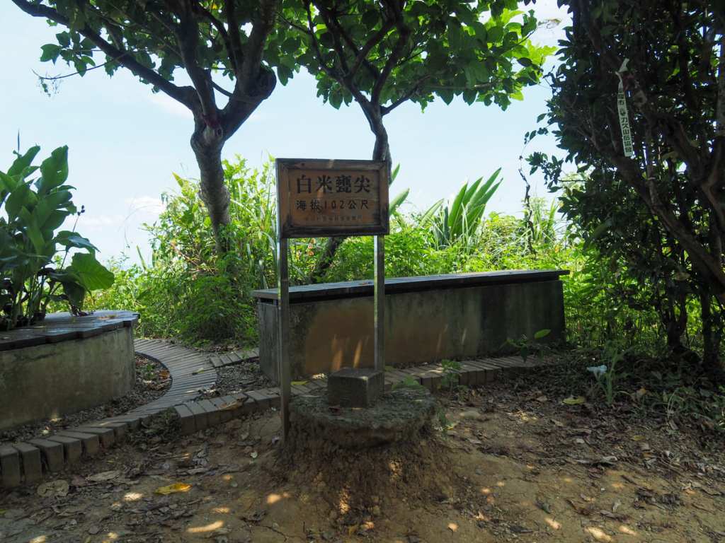 The trail quickly climbs to Baimiweng Peak (白米甕尖), which is marked by a couple of benches and a triangulation marker. “Baimiweng” means “white rice urn” and there’s an interesting local story behind the toponym. The tale holds that in Qing- and Japanese-era Taiwan, life was tough for the residents of Keelung, and white rice was a luxury that was hard to come by. But at a spot, somewhere around here, grains of rice were said to flow from a crevice—not much, but enough to satisfy hungry bellies. However, it seems that the inescapable human trait of greed reared its ugly head, and some people began digging into the rocks to get more rice. Their doing so irritated the gods so much that the rice tap was shut off and no more miraculous white rice flowed from the ground.