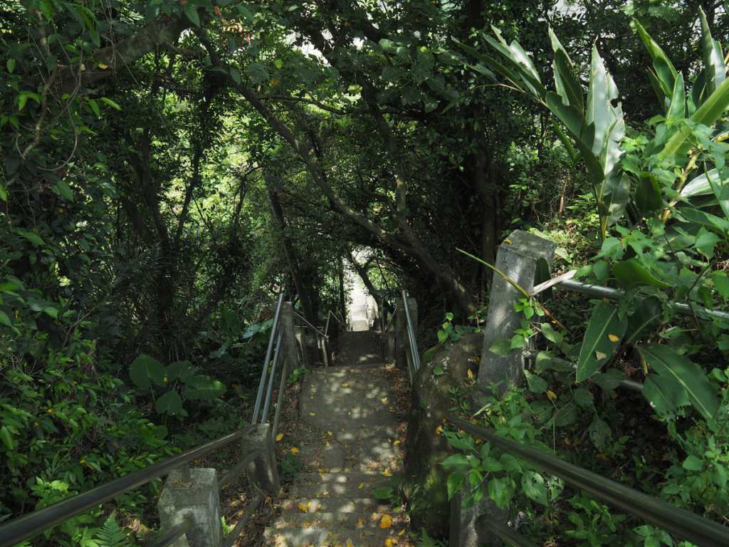 A steep flight of concrete steps cuts down from a military observation bunker towards Baimiweng Battery.