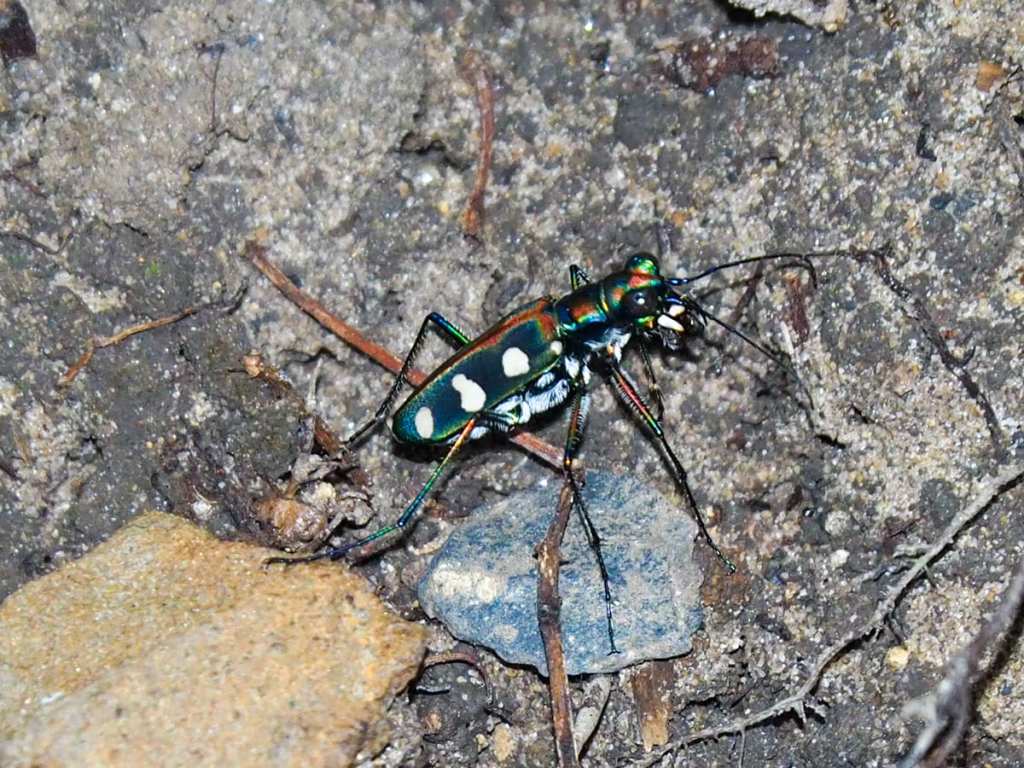 A Cosmodela batesi beetle. These gorgeous bugs are around 2cm in length and can often be found staking out specific sections of path in the summer months. With a decent camera and a modicum of patience, it’s usually possible to get a reasonable photo of their iridescent carapace.