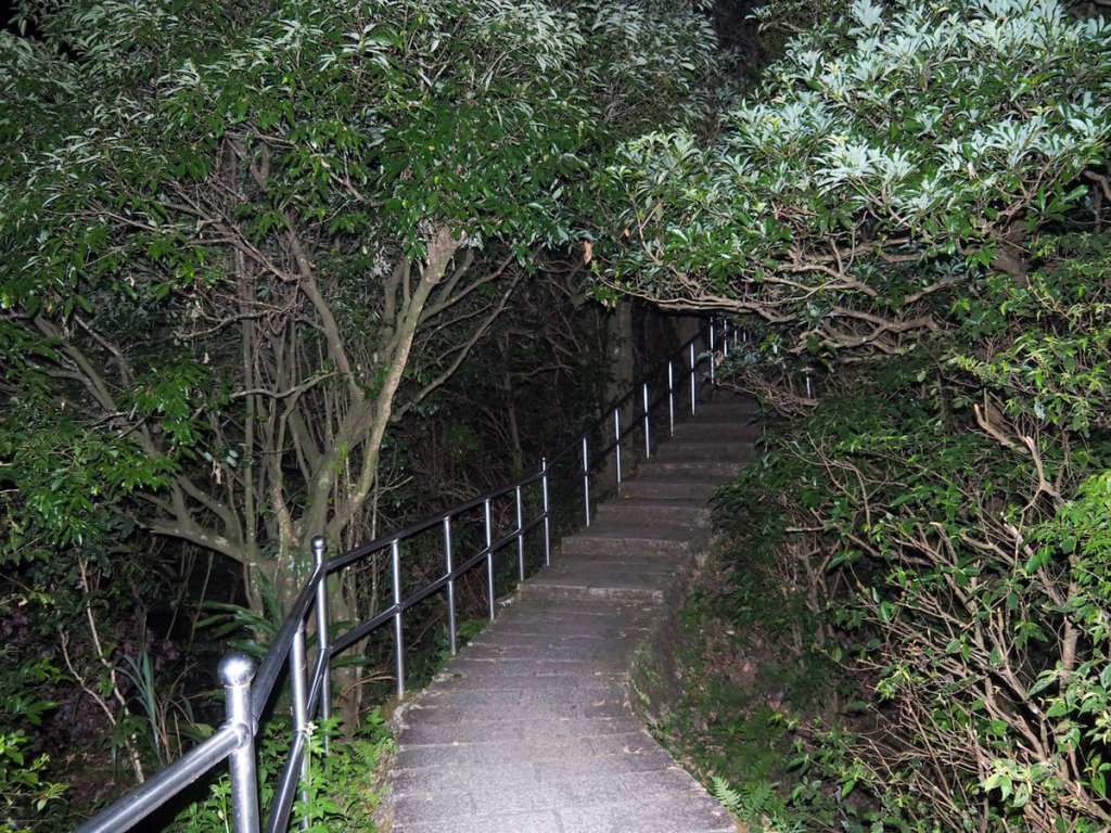 Steps ascend steeply more or less the whole way to the peak, and while there are lights along the first 100-200 metres into the trail, after that, you’re on your own.
