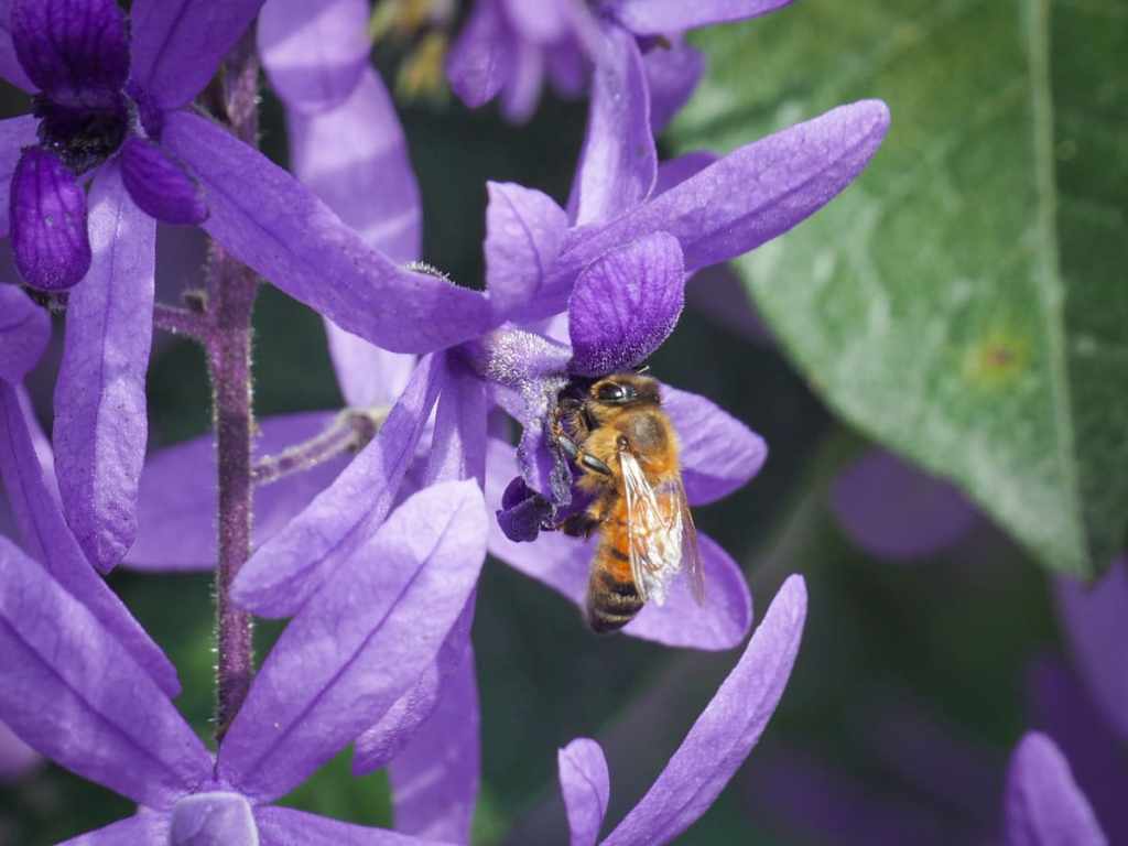 The entrance to the bridge is flanked by trellises of purple queen’s wreath vines, which, in thesunny weather of the day before, were full of all kinds of bees.