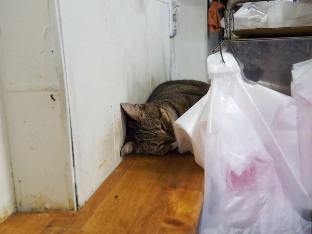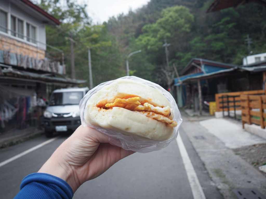 I stopped at A Chun’s breakfast shop and picked up a couple of steamed buns with egg. It must have been rush hour because the grandma and young woman duo running the place had half the village in and out while I was there. The store cat was slacking off though. It was wedged between the wall and the heated bun cabinet, stealing the warmth.
