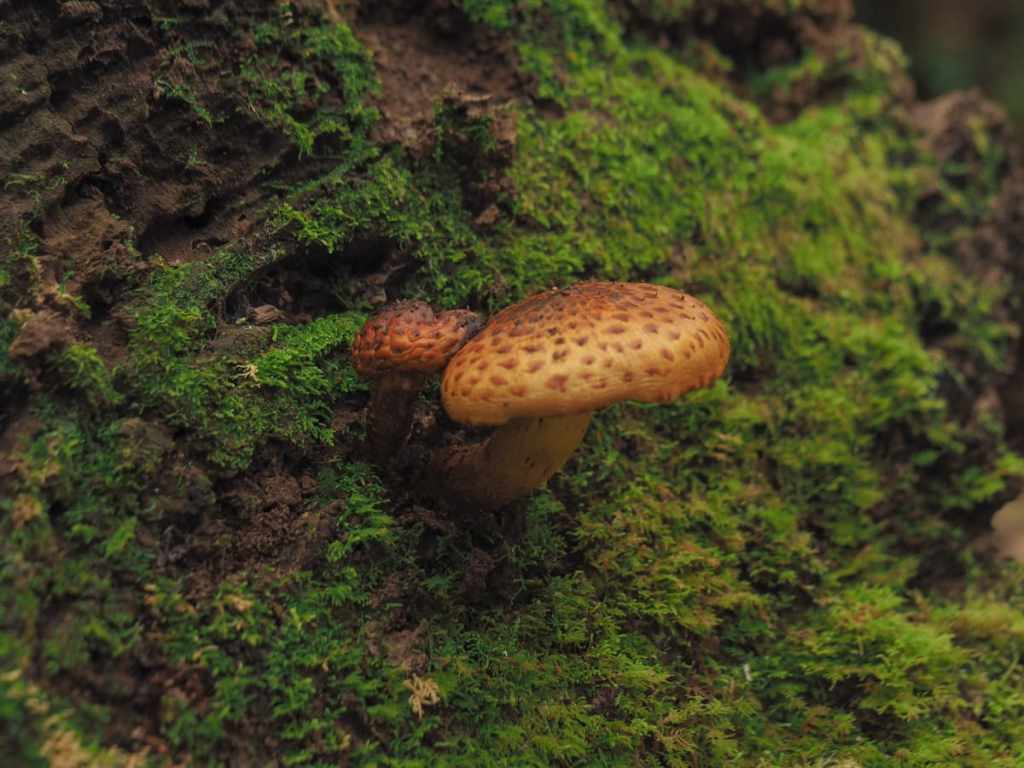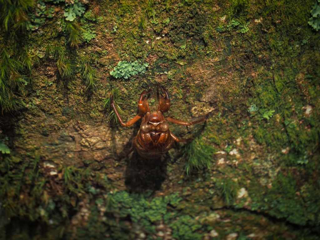 A cicada exoskeleton and a mushroom.