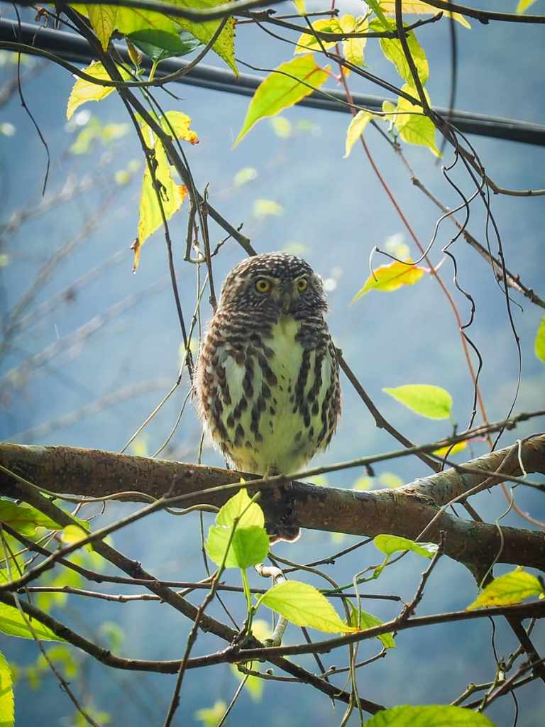 At one point, I happened to glance up into the trees beside the trail and spotted this absolutely adorable collared owlet. I’d not seen one before, and I couldn’t believe how tiny they are — just a smidge larger than a can of coke.