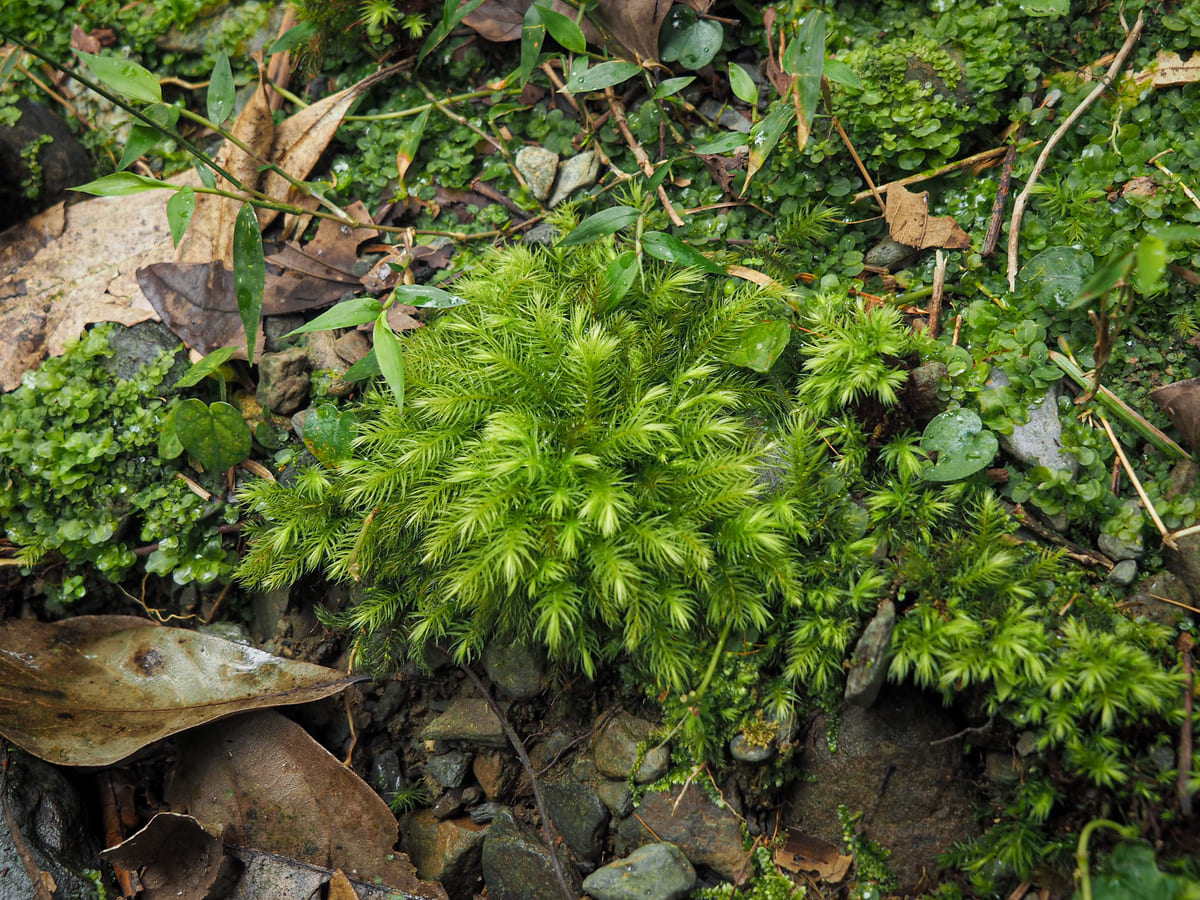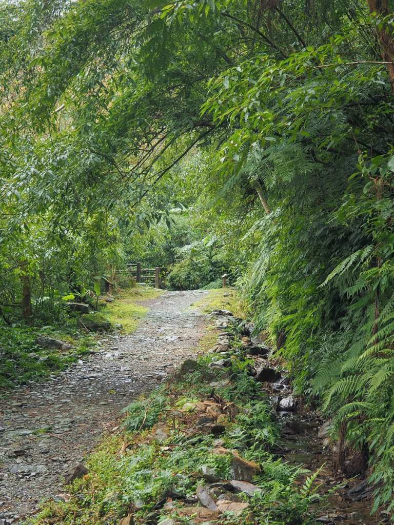 A wide gravel track slopes gently uphill from the trailhead. A small stream runs along a channel beside the path for a while, and right from the start, the ferns put on an impressive show.