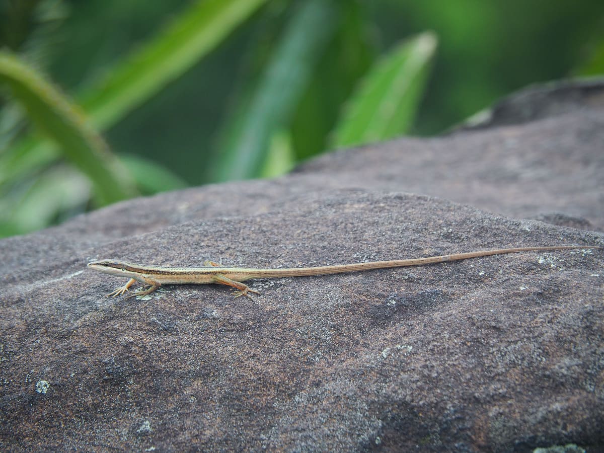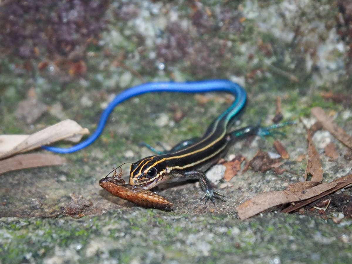 At the next junction (right again), I got distracted by this rather lovely little elegant five-lined skink (“elegant” is actually a part of its name). It was a youngster (the younger ones have brighter tails than the adults), and had caught a mountain cockroach that it was busy devouring. Usually, skinks are very flighty and won’t let you get too close, but this one was so excited about its meal (and maybe just so young and silly) that I was able to creep very close. Watching it for a while, it seemed to be practicing its hunting on the (already dead) cockroach and would approach it again and again with its tail excitedly flicking from side to side in anticipation.