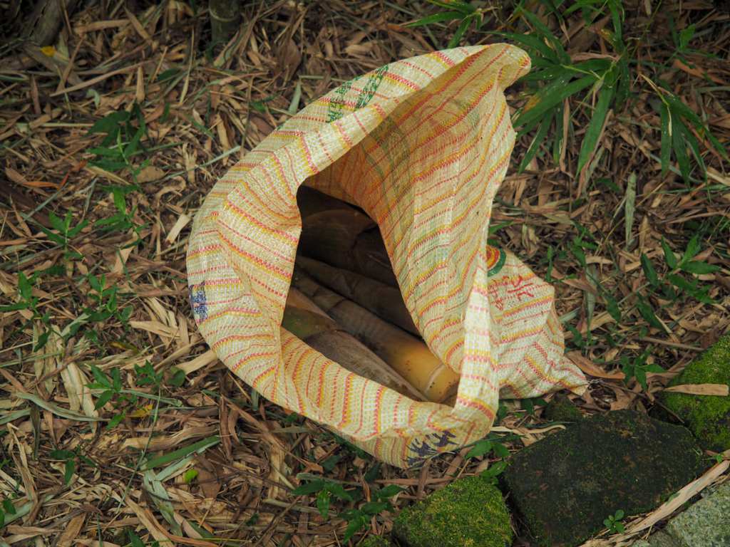 A little way into my journey, I came across this sack of shoots beside the trail and a rhythmic thwack, thwack, thwacking emanating from somewhere behind a messy spray of bamboo culms let me know that their forager was nearby.