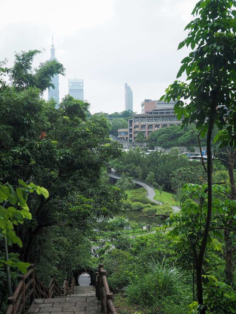 The steps lead down to Yongchunpi Wetland Park — Taipei 101 looming unexpectedly prettily behind the ponds.