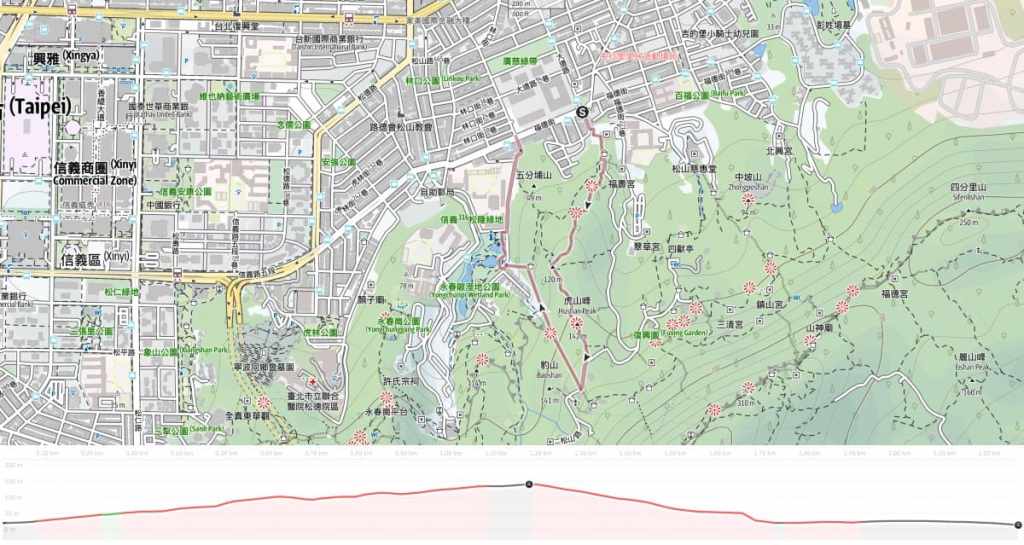 Bathroom facilities: There are toilets at Songshan Fengtian Temple near the start and Yongchunpi Wetland Park at the end.