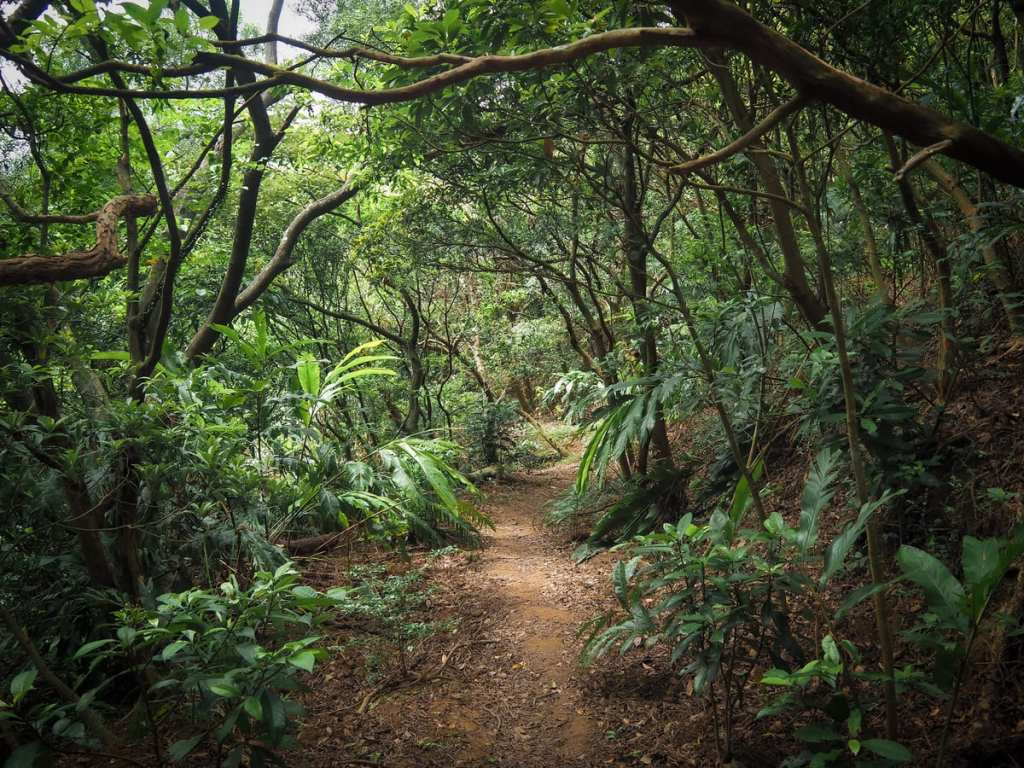From the somewhat overgrown pavilion at the trailhead, the path cuts across a long-abandoned courtyard where a banyan tree is propping open a door in perpetuity, and from there, it swiftly begins climbing raised boardwalk steps.