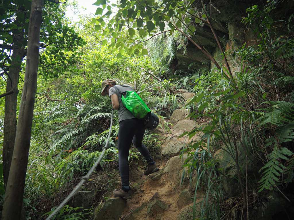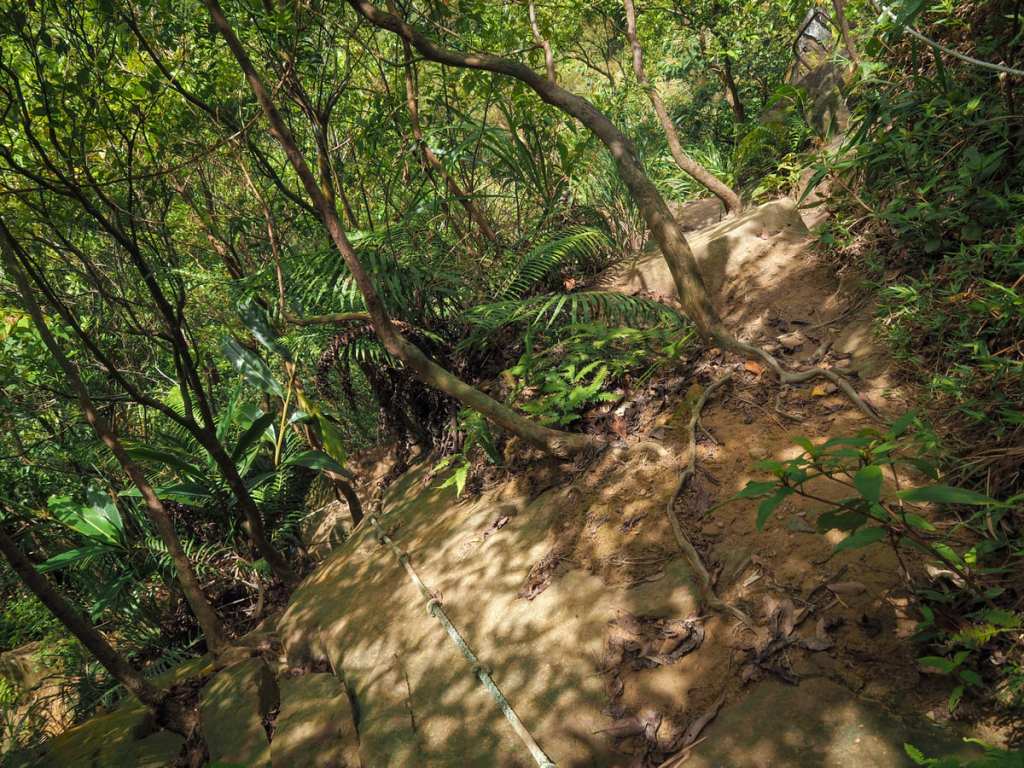 From the lookout spot, the trail descends steeply as it heads down to join Banping Stream. There are lots of ropes and roots to provide extra assistance.