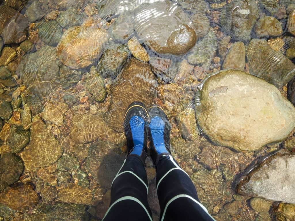 Since we’d hiked up in our trail runners, we found some handily places rocks to sit on while we switched into river tracing boots.