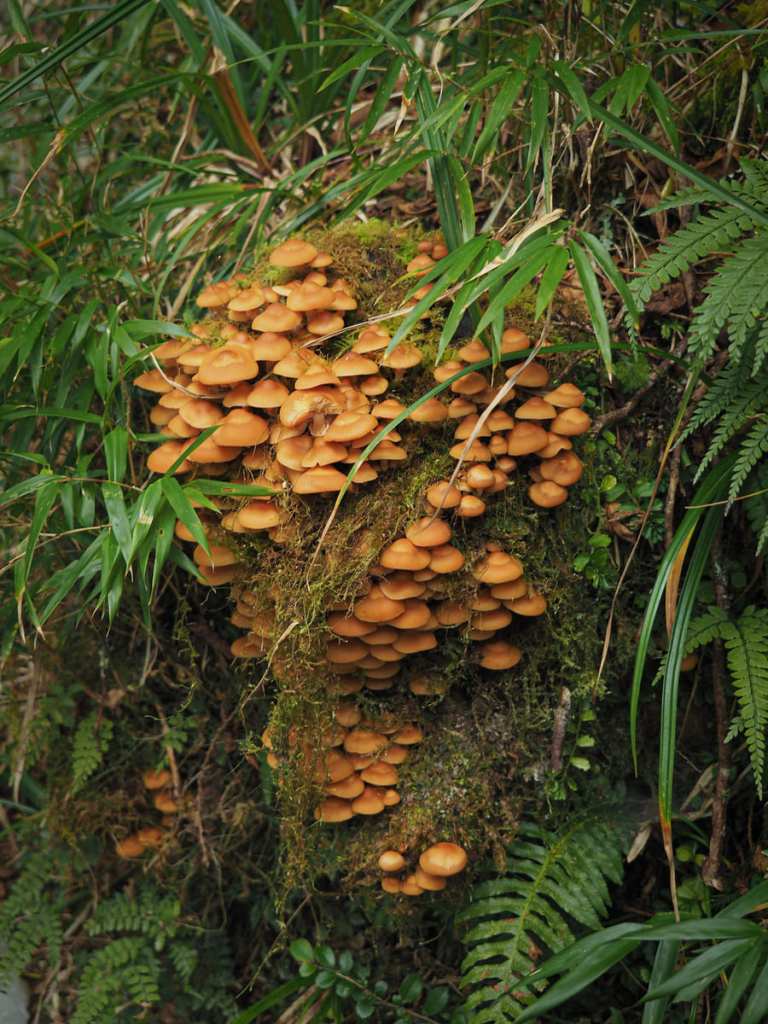 A profusion of fungi sprouting from a stump beside the trail.
