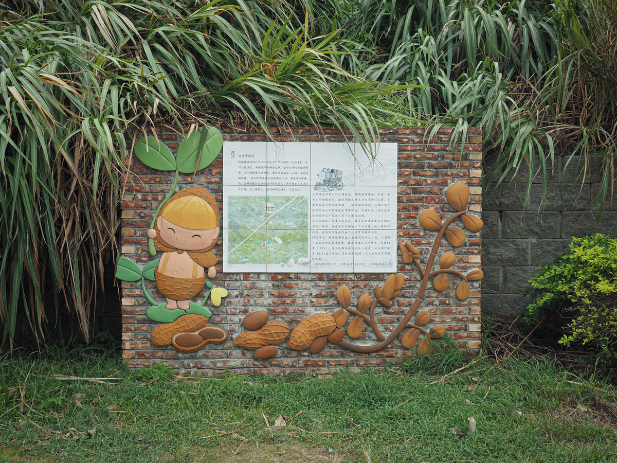A cute anthropomorphic peanut welcomes visitors to the start of the old Guogang Tunnel path (過港隧道 or sometimes 後龍過港隧道).