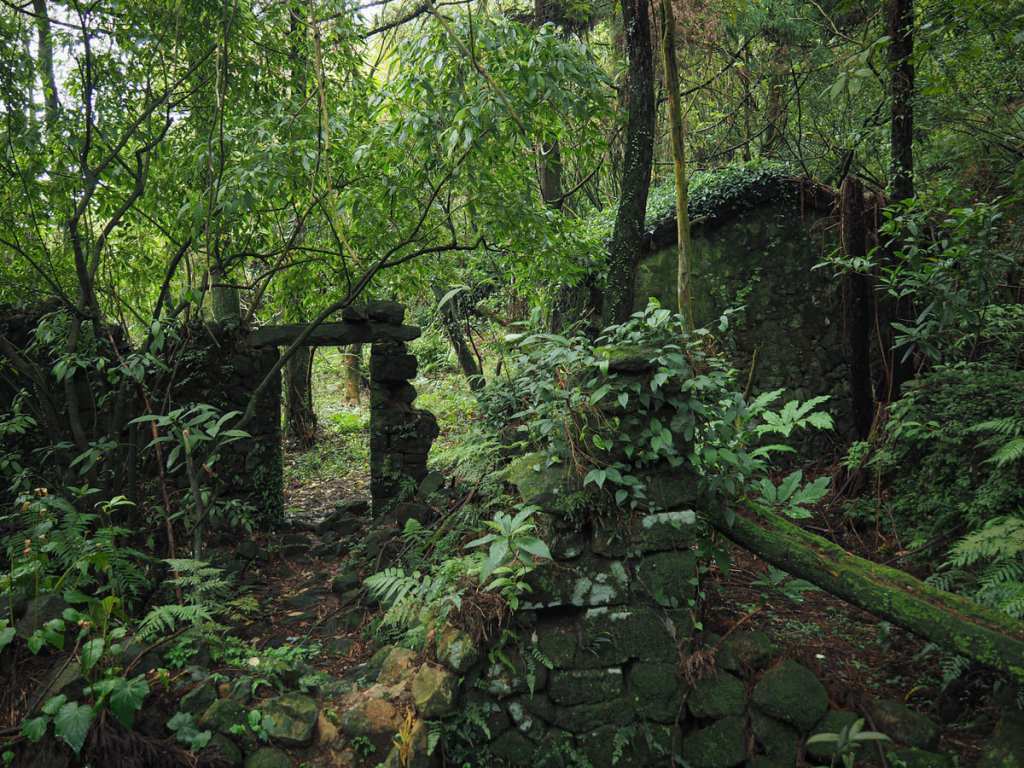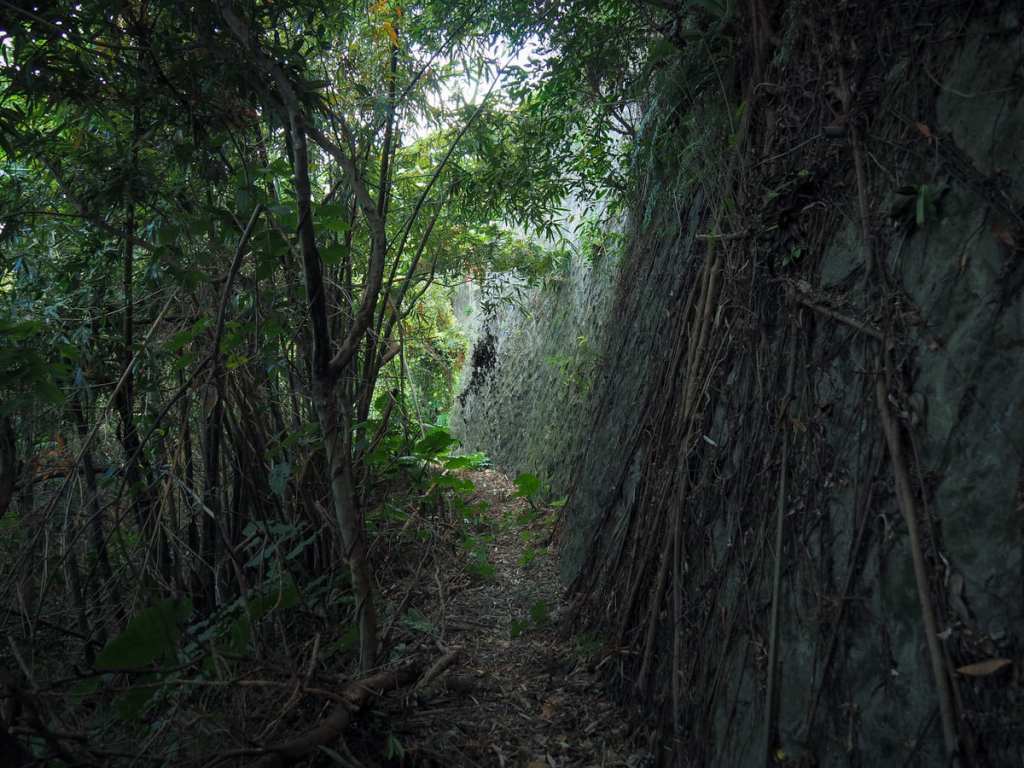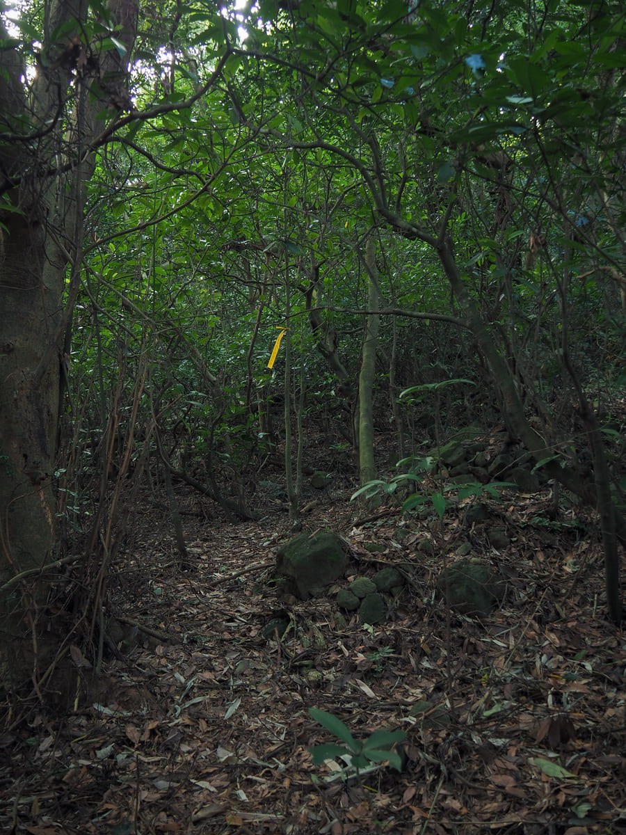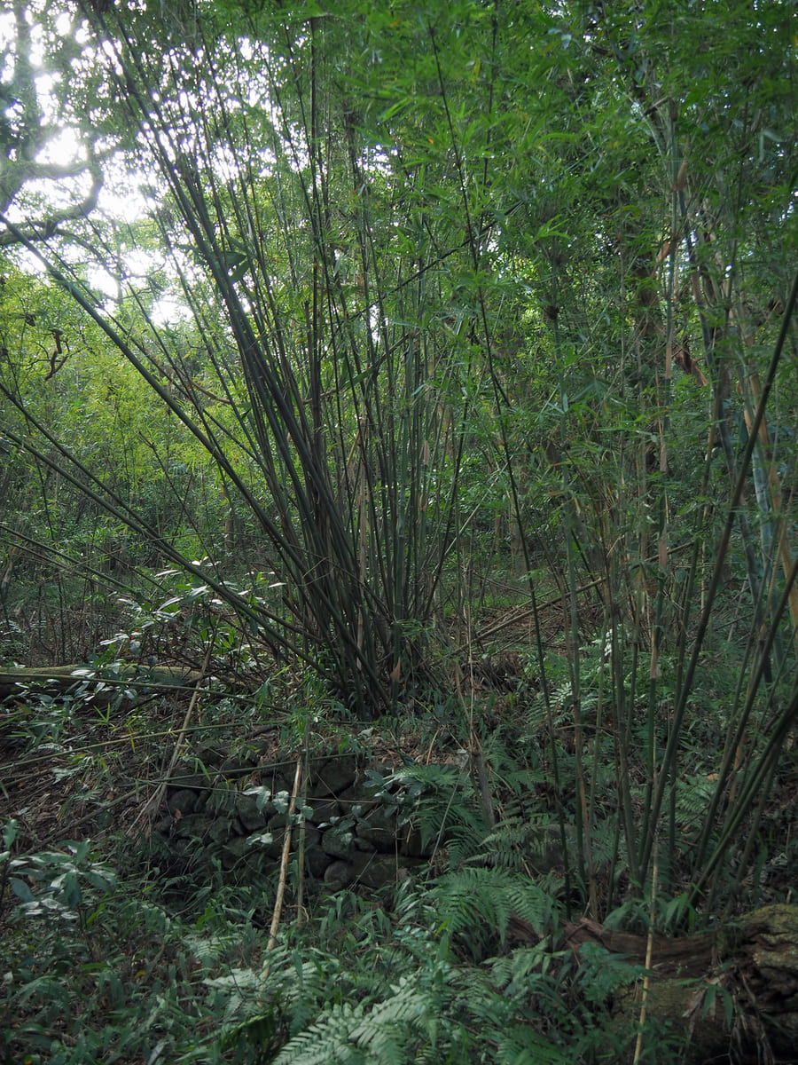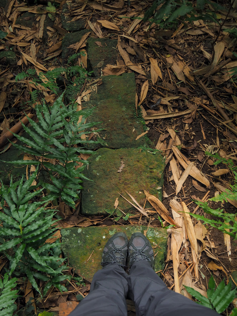 The trail hooks a left turn at the bottom of the bamboo farmer’s patch and dives back into woodland that is littered with more old stone walls. The path itself is clearly an aged trail too. On more popular routes that required sturdier trails, trail builders of old places a large flat central stone between two smaller supporting ones, but on small trails like this, farmers made do with less durable single-file steps. In places, one or two of the steps had rolled away, but most of it was still walkable.