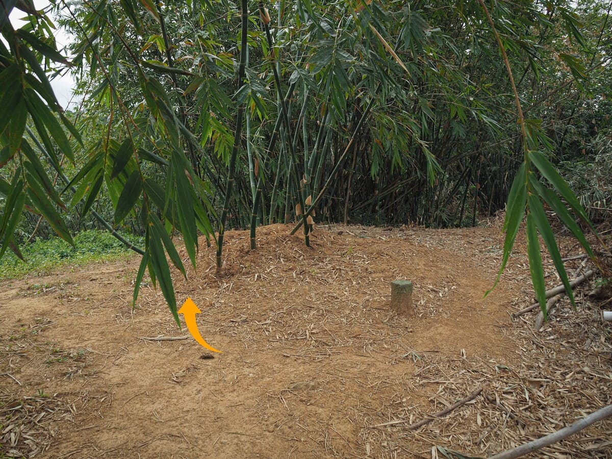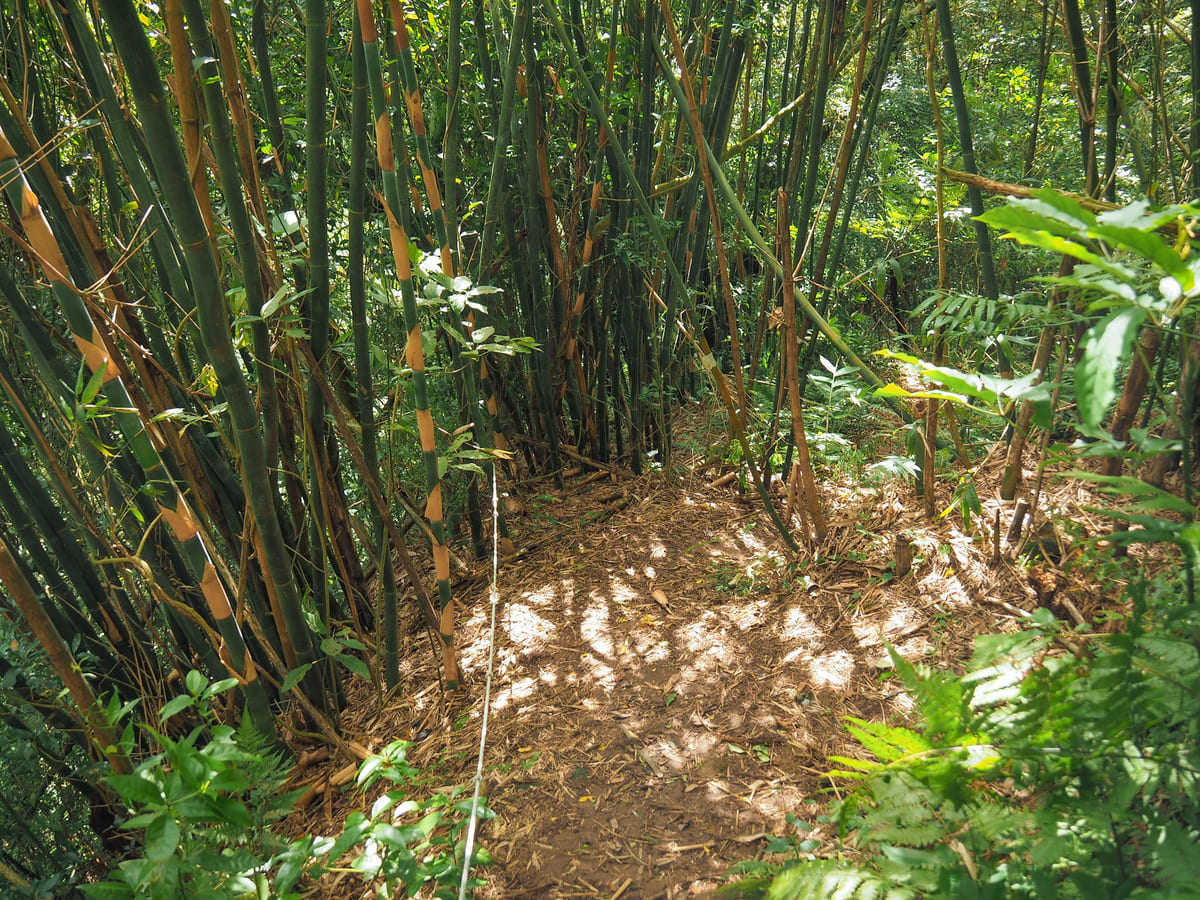 The trail still feels a little unloved, but it is at least clear to see where you’re going. At first, I found myself passing through scruffy woods, then soon I arrived at the top of a long slope of farmed bamboo. (The map I was using indicates that there are two side trails joining on the left from the main road along this stretch, but I didn’t notice them.