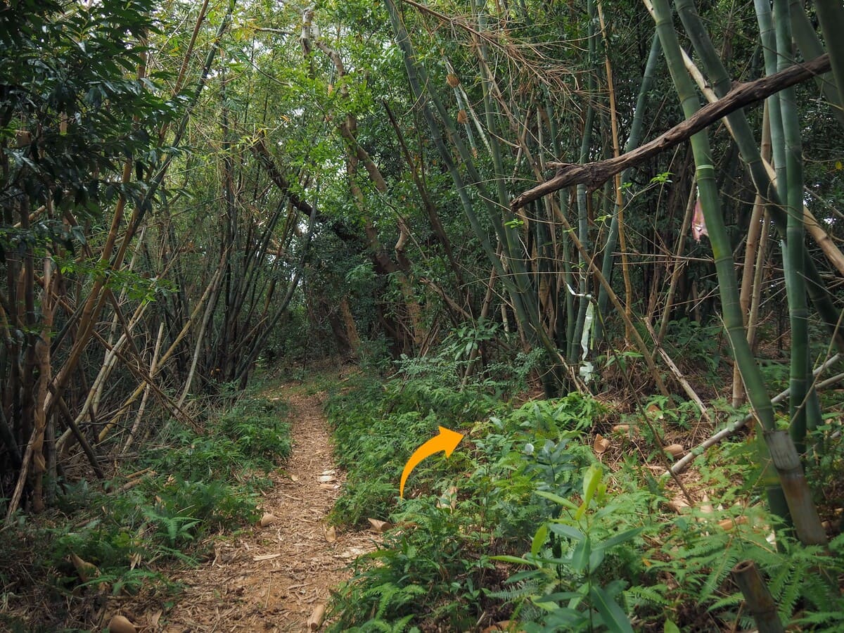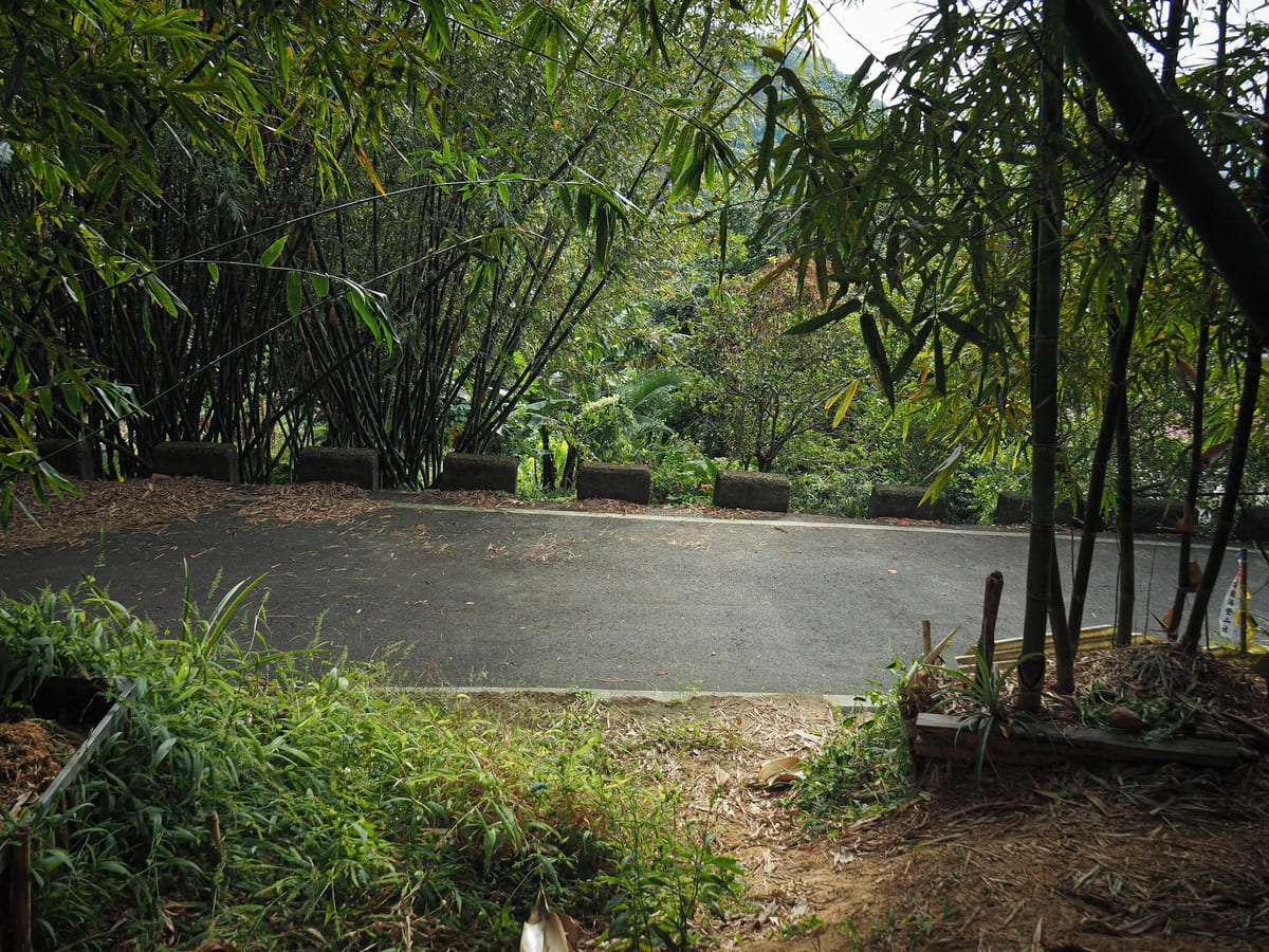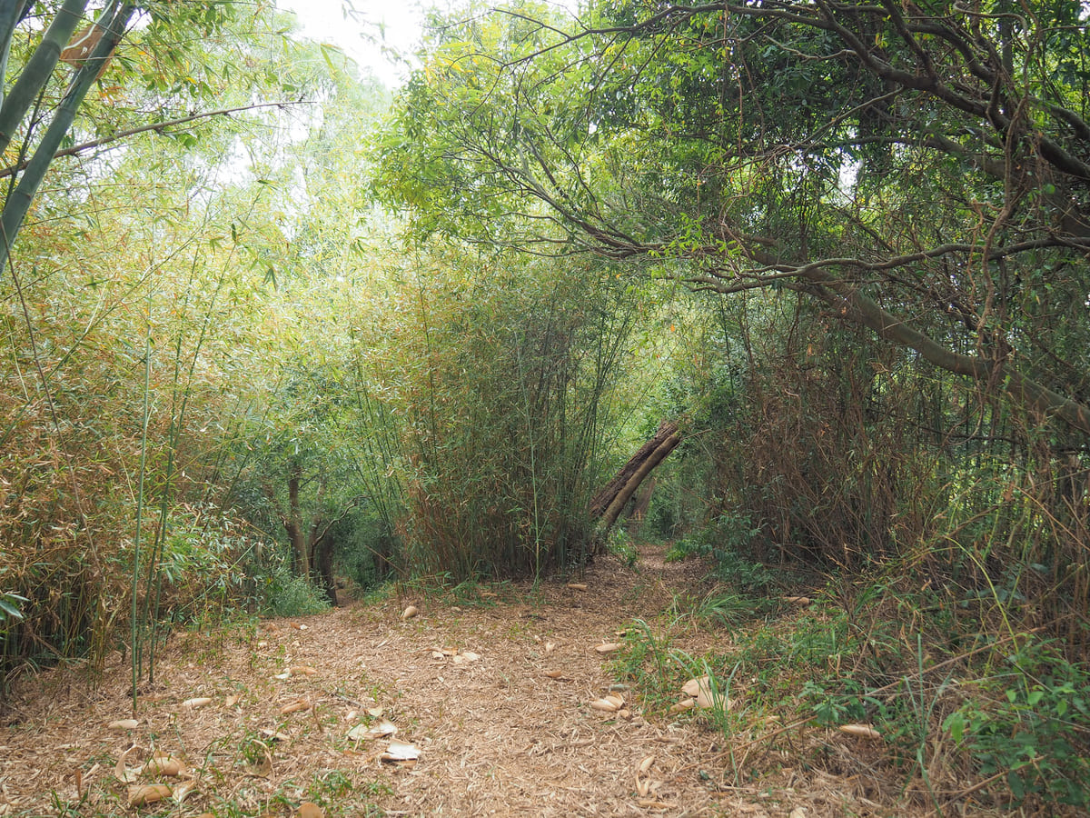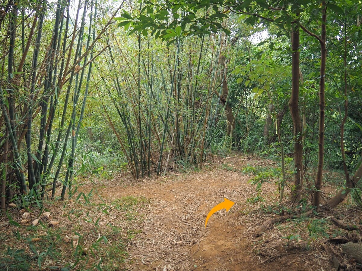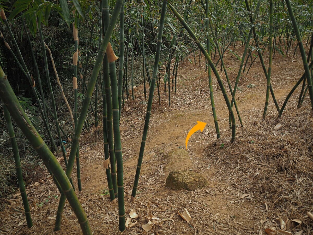The path makes its way through a bamboo farm. At first, it looks like there’s no through trail, but just keep heading straight and you’ll find a trail leading away into the trees. A short while later, the path veers to the right.
