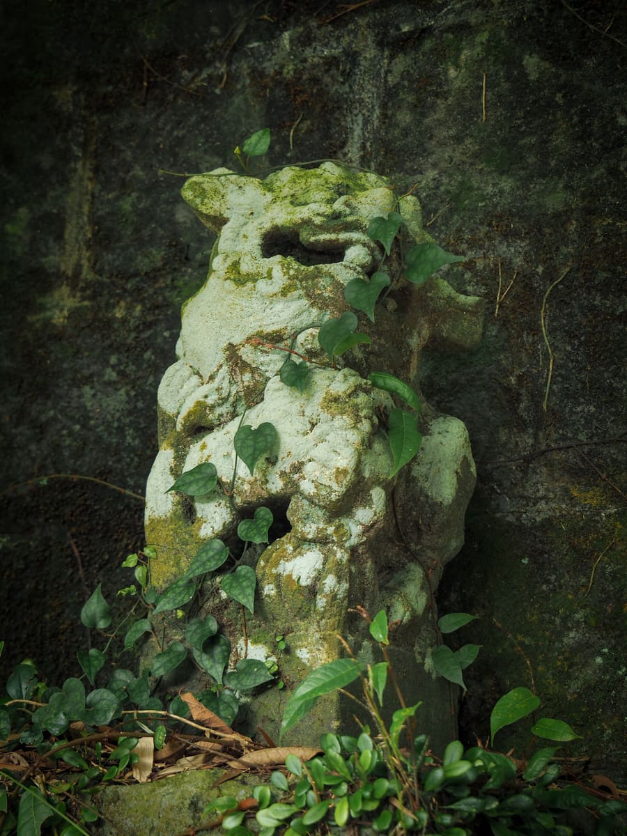 The road heads down past a long-abandoned temple. Only the archway and a pair of guardian lions give away its location.