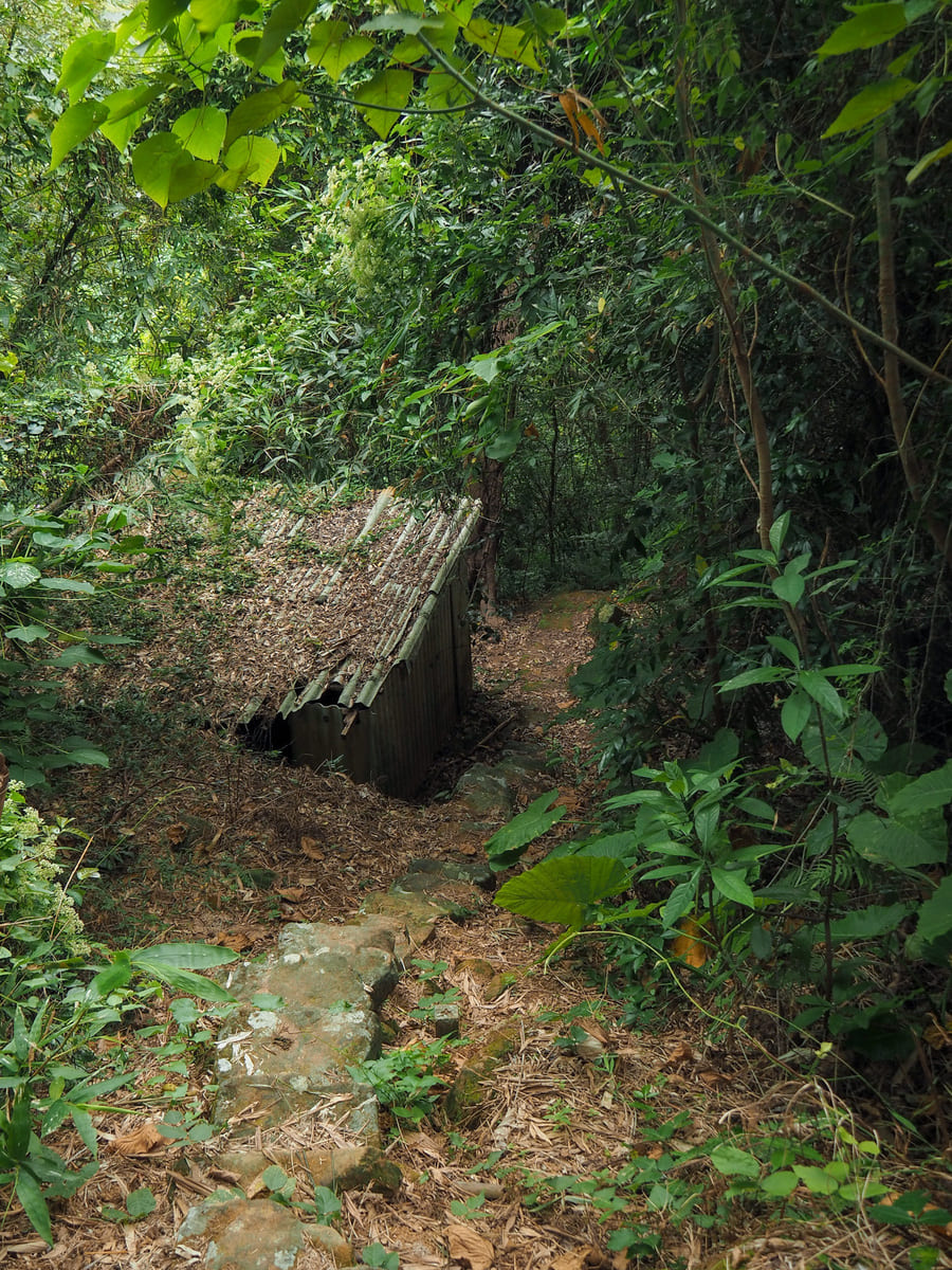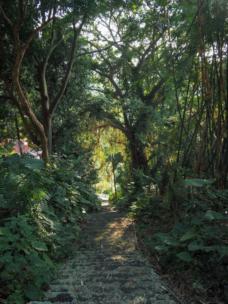 The trail continues straight over from where the path arrives at the road, but I needed to walk down to the crossing then back up. The short flight of steps terminates at a small temple, and once more, you’ll need to cross the road and keep heading down.