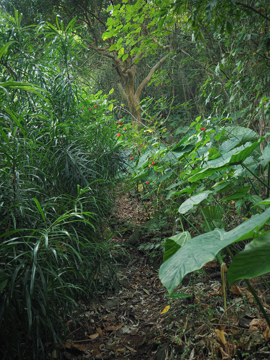 This section of old trail is very obviously almost forgotten. I tramped over shell ginger leaves and through spider webs following the almost imperceptible path.