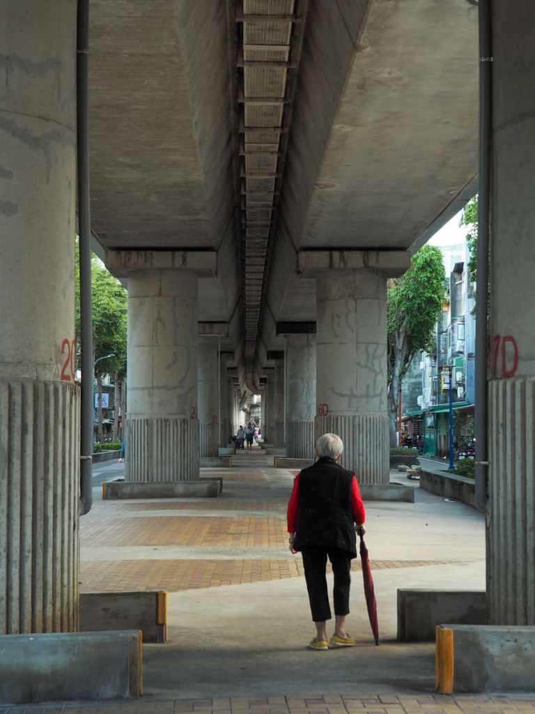 Follow this lane until you reach the elevated MRT line, then turn left.