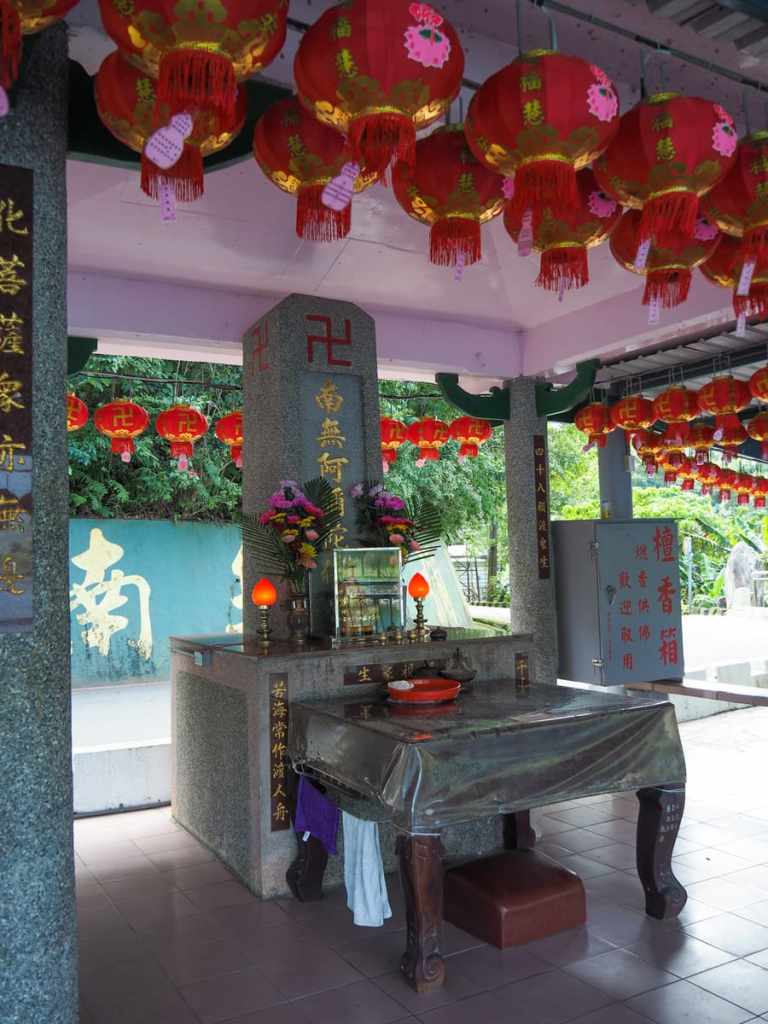It has a simple altar with a single Guanyin idol and the ceiling is strung with many lanterns which frame the view of the lake rather charmingly.