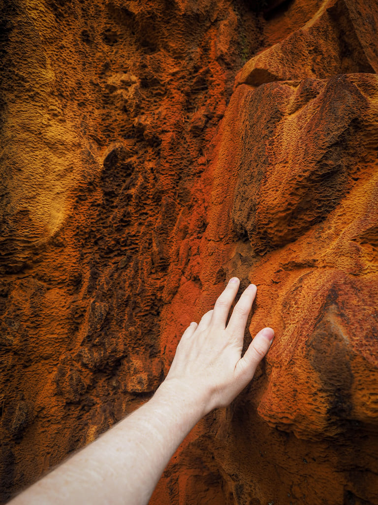 One patch of the mine’s walls is stained with bright orange mineral deposits.