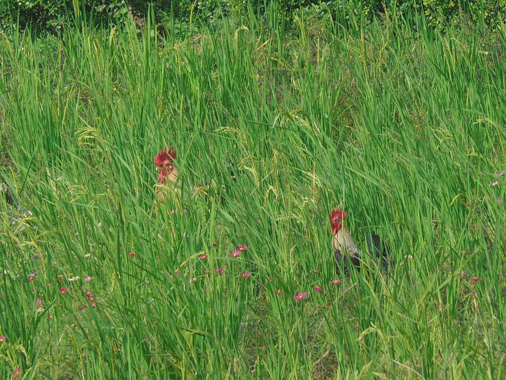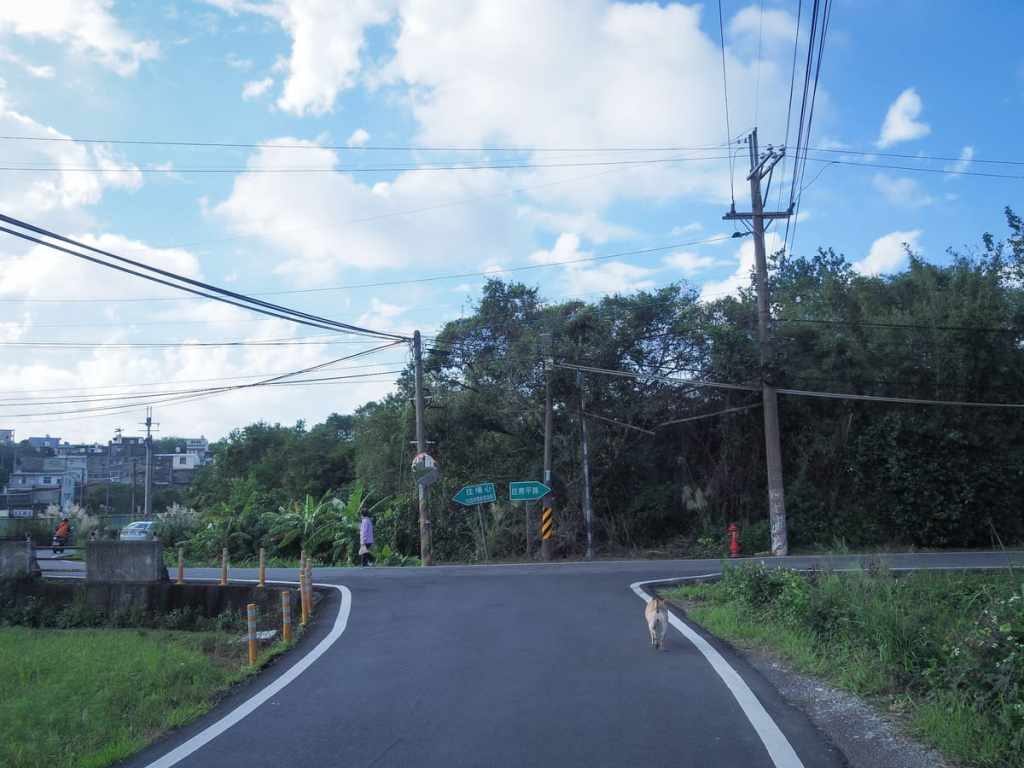 The route continues by following single-lane Zhenyong Road (鎮鏞路) through small farming hamlets. In November, several fields were full of cosmos flowers and I encountered a flock of free-roaming chickens. Stopping to watch them for a while, I was entertained by their antics — they kept jumping to try and catch the drooping seedheads in their beaks.