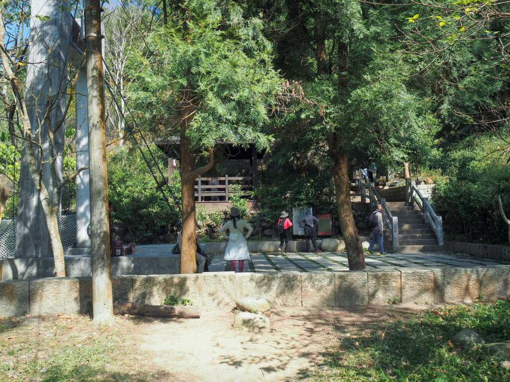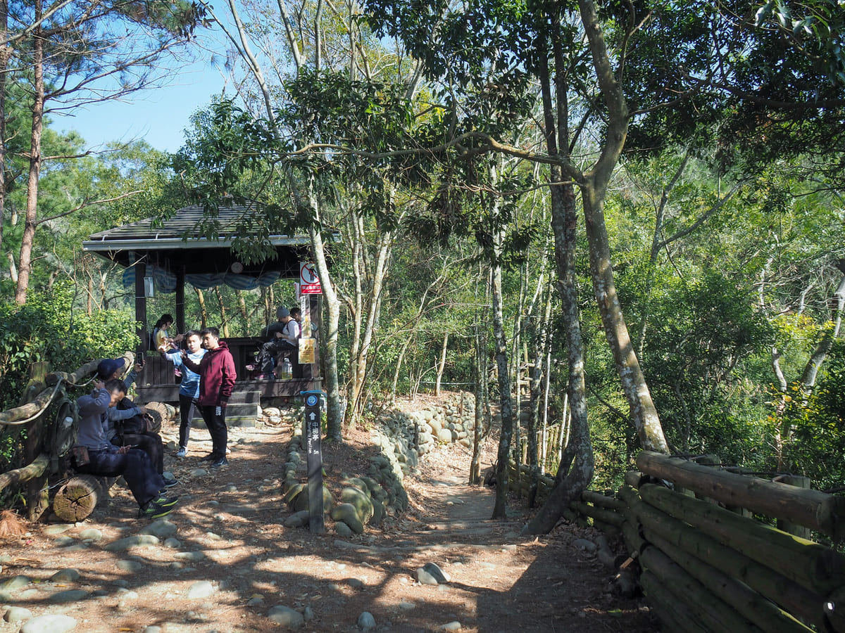 Soon, the trail connects to the main network. This is the junction between Dakeng No. 4 and Dakeng No. 3-1. We had planned to walk up via trail No. 4, so we headed up to the right past a shelter full of people taking a rest.