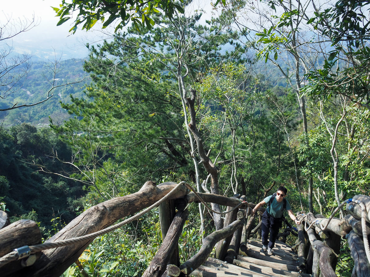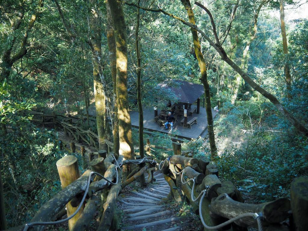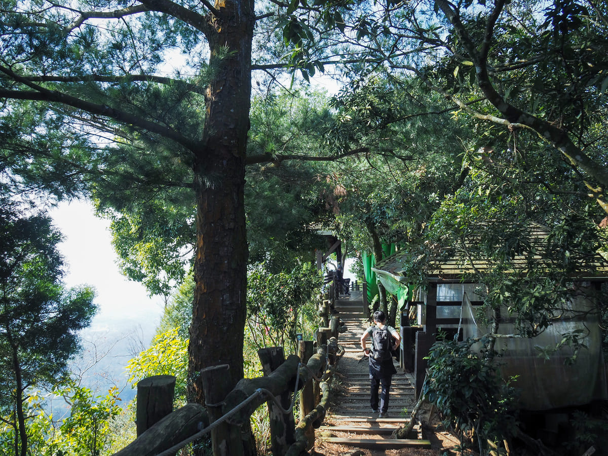 On top of the next peak, we found Qingjing Pavilion (清涼亭). Like a couple of others along trail four, this rest area has recently been renovated. In fact, this is a stupendous mountaintop rest area. Many small sections of seating are spread around so that groups can split off into their own areas. It’s a great use of the available space. We took a short break here before setting off again.