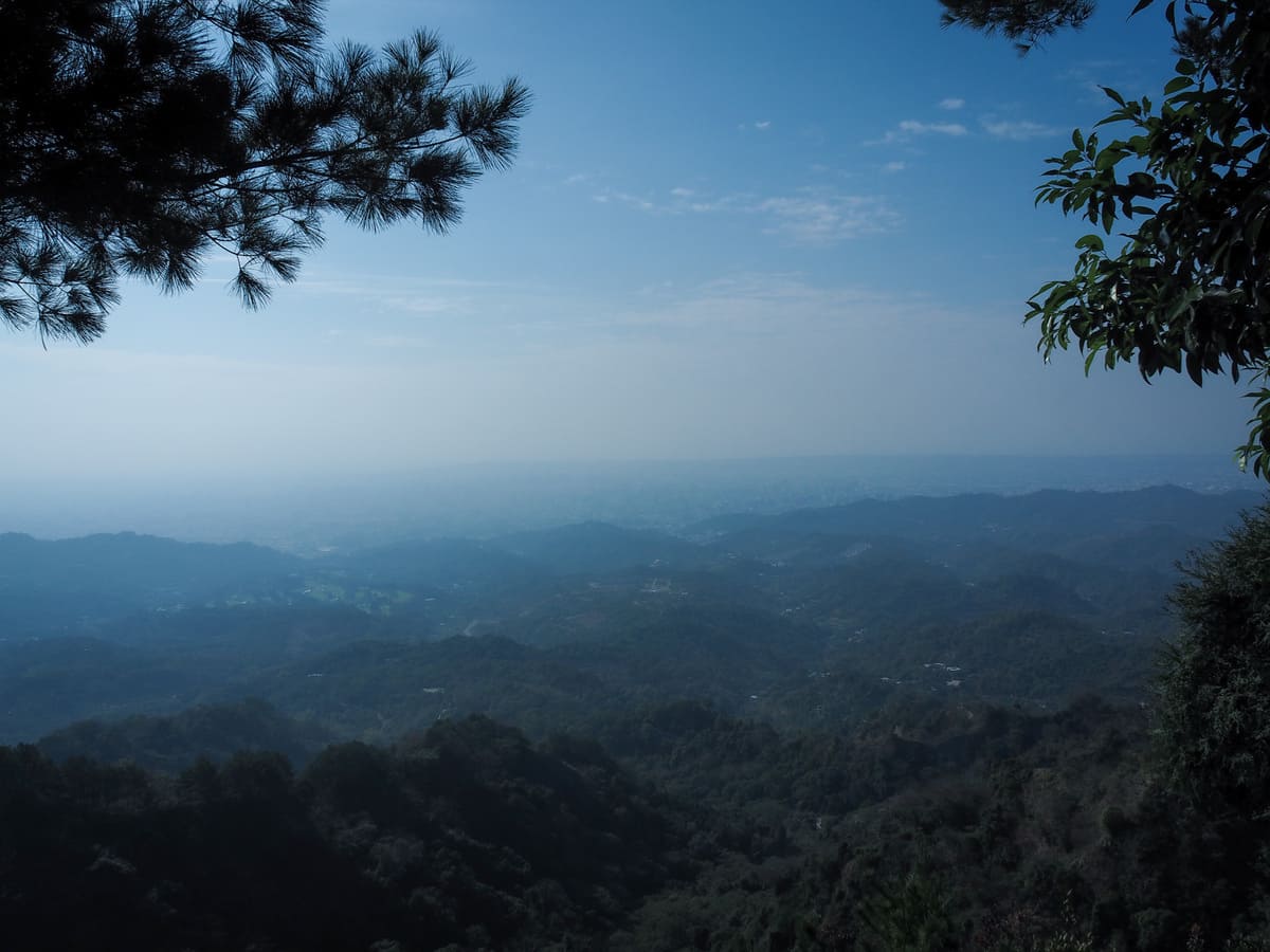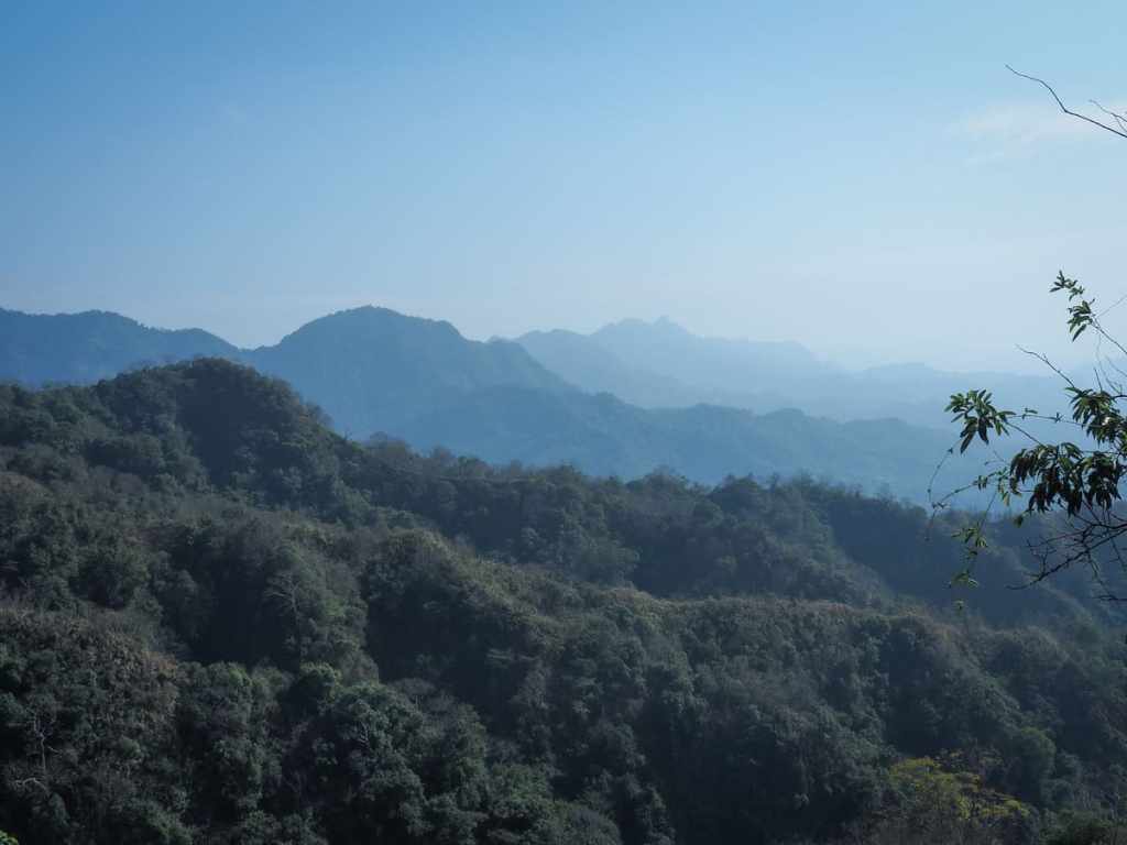 At a couple of places, the trees on the right opened and we could see over the mountains to the south. That most prominent hump in the middle row of mountains at about a third of the way in from the left is Mount Anying (another Xiao Bai Yue that I haven’t yet climbed), and further south in the back row of hills the sharp peak just right of the centre is Mount Dahengping (which we walked a few months back). Apparently, it’s also possible to see Mount Junda and Yu Shan, but I wasn’t sure with all of the haze.