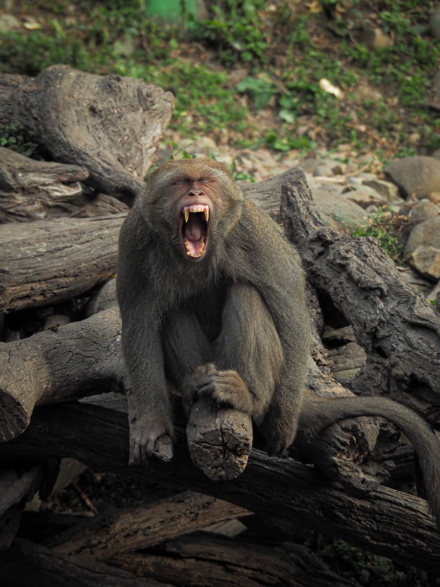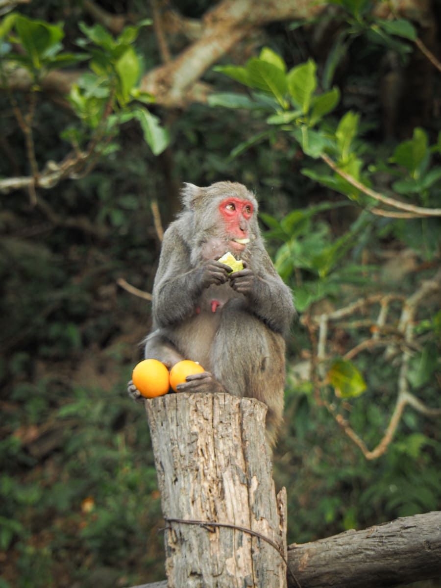 The woman at the ticket booth was shocked that it had taken us so long to climb, but told us that we’d arrived at the perfect time. We headed over to listen to the uncle with the loudspeaker laying the ground rules for the audience. The monkeys here are semi-wild. They belong to two separate troupes and come and go as they please, spending most of their time roaming the hills up where we’d just been walking. In the past, tourists in the area would come and feed the monkeys, and obviously, that is not a good idea. As you’ll know if you’ve visited other places where tourists feed the monkeys, this escalates the risk for both sides. With every session, management at this park includes an educational talk that instructs visitors on what to do or not do when they encounter wild monkeys. So, while I’m still not sure how I feel about this place, it is obvious that it’s run by people who are well-intentioned and who are trying to ensure harmony between Taiwan’s two species of primates.
