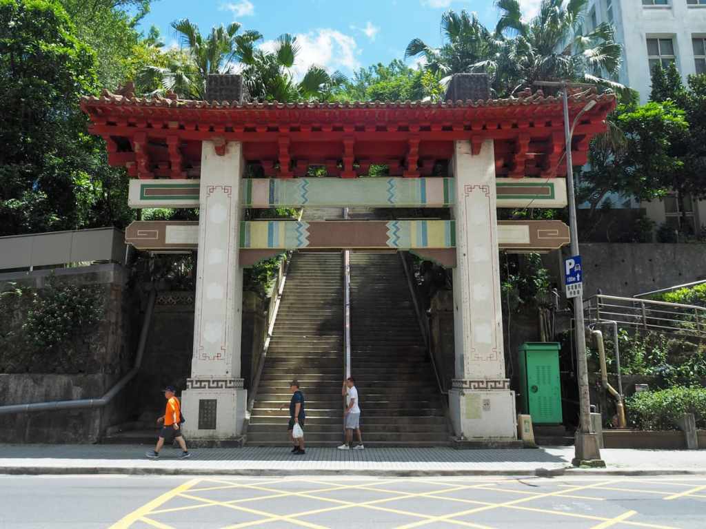 穿過人行天橋(或直接沿著馬路走)前往一座小型金屬牌樓,上面標示著名山宮的入口。