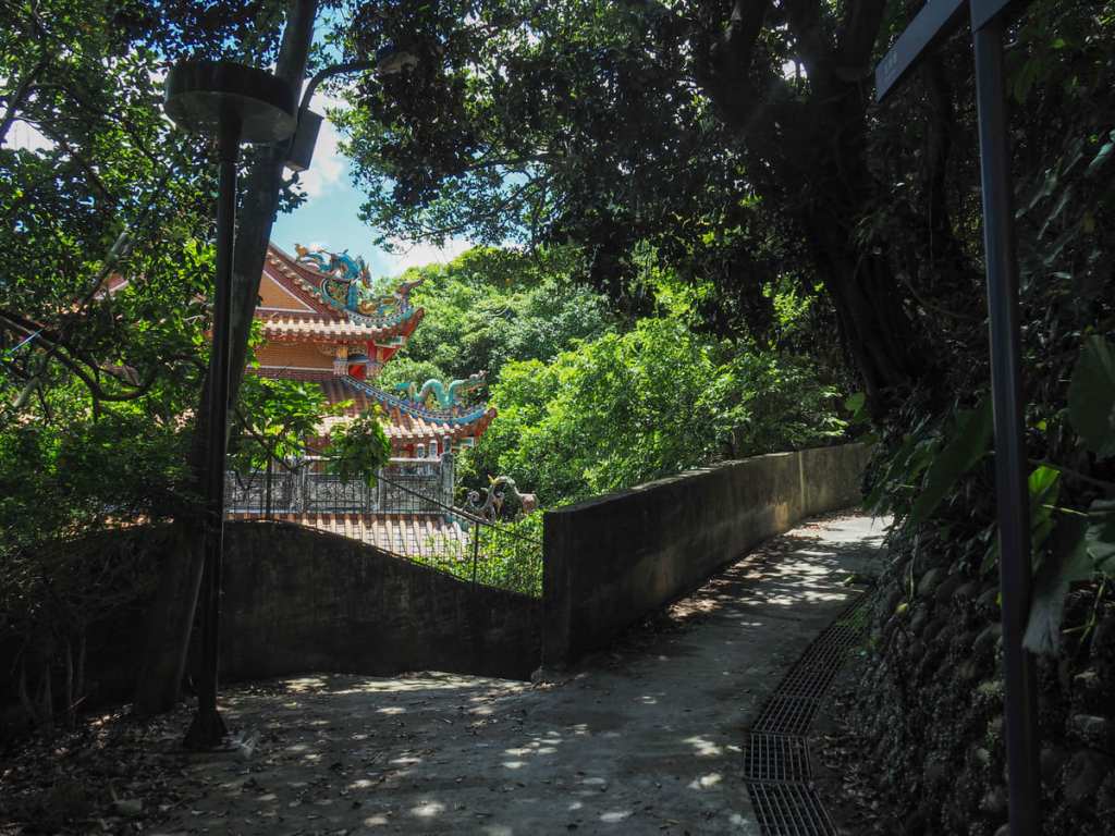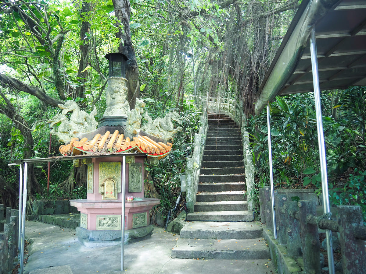 步道帶我向上走,穿過一座涼亭後抵達這座小廟。金屬柵門將廟內供奉的神明與外界隔開並加以保護。