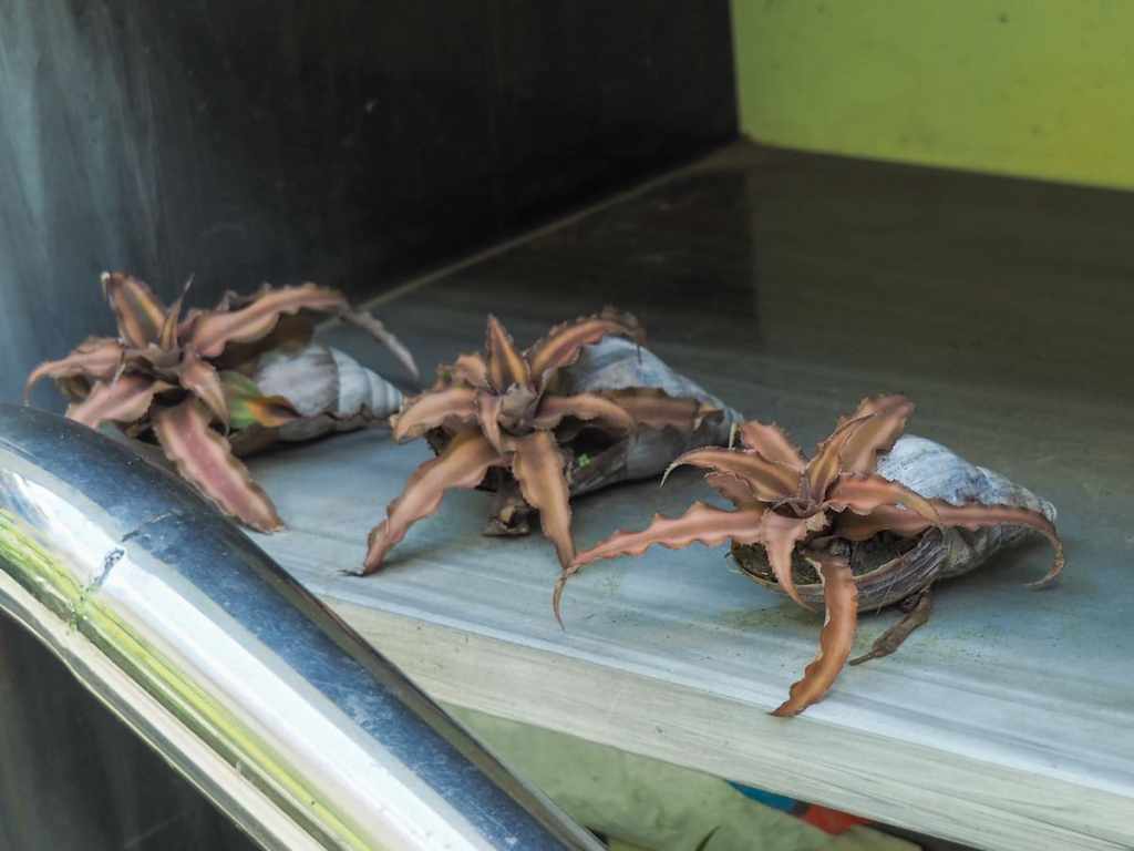 有位住戶把這些蝸牛殼變成了吊蘭的花盆。