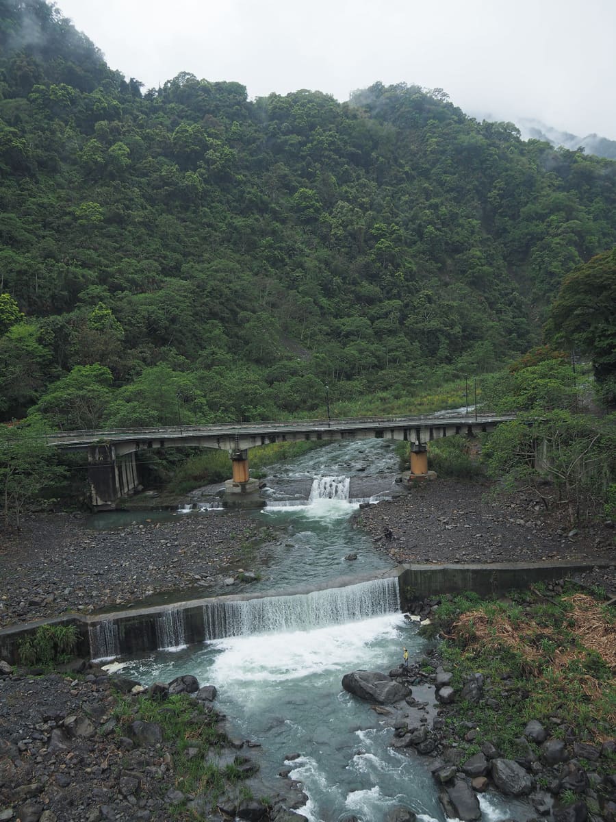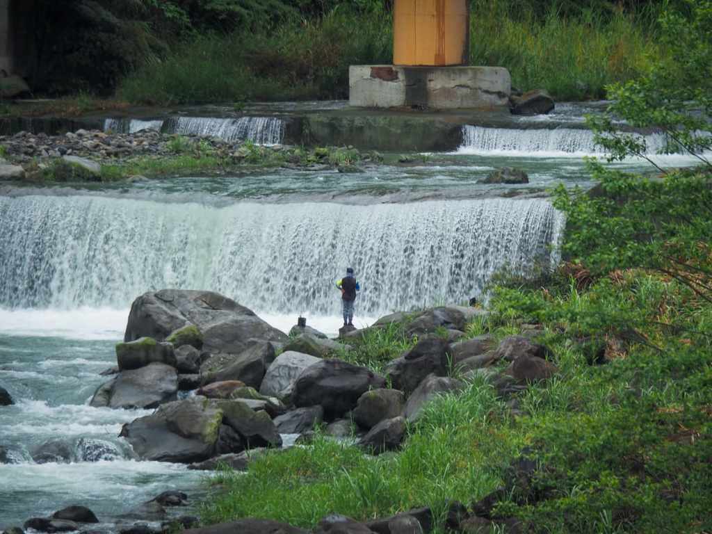 過橋跨越上坪溪時,我看到有人在雨後暴漲的水潭裡釣魚。