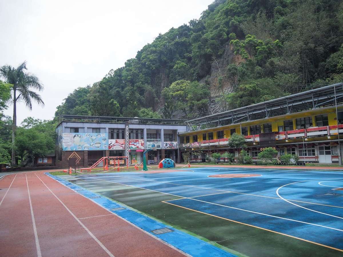 過了第一座橋,我們來到桃山國小。這裡的孩子們顯然擁有和都市孩子截然不同的成長經驗——教室門上裝飾著泰雅族圖騰,操場旁還有仿造的傳統木屋和穀倉建築。