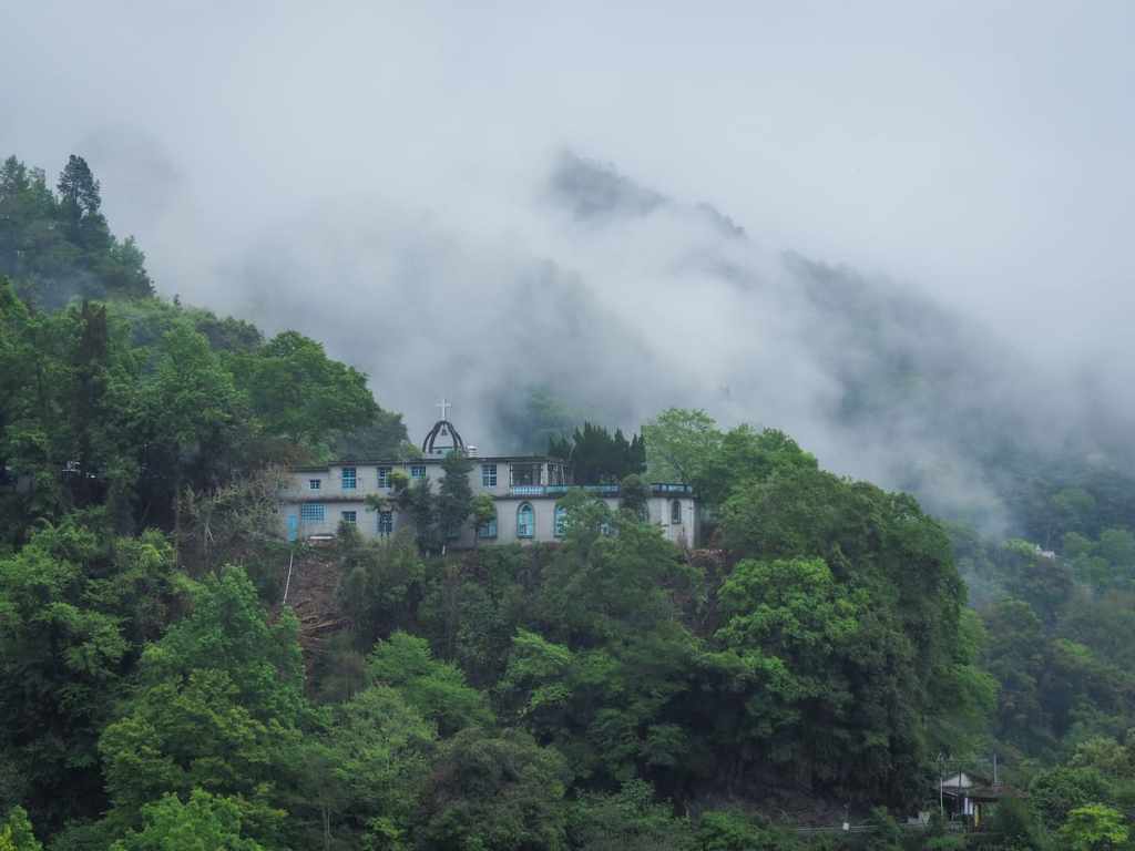 清泉天主教堂高聳於河岸之上,遠方山巒間雲霧繚繞。
